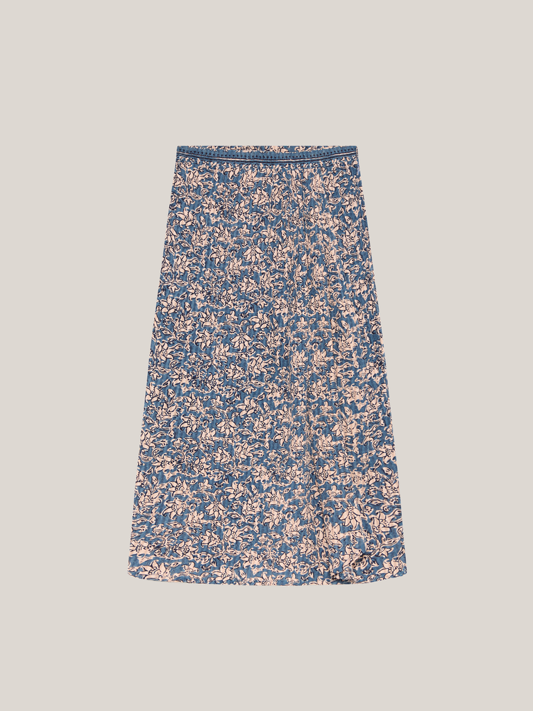 The cut is straight with a midi length, skimming the hips before dropping clean. A narrow waistband keeps it simple, while a side pleat adds a touch of movement.