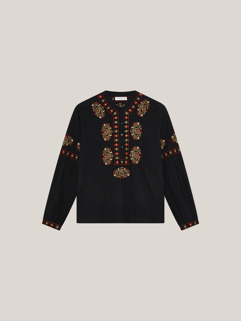 Crafted from lightweight cotton schiffly, the Bruna Blouse comes in black and is richly embroidered with chandelier–inspired motifs in deep red and gold. The placement runs across the chest, sleeves and cuffs, giving the piece a bold, ornamental character.