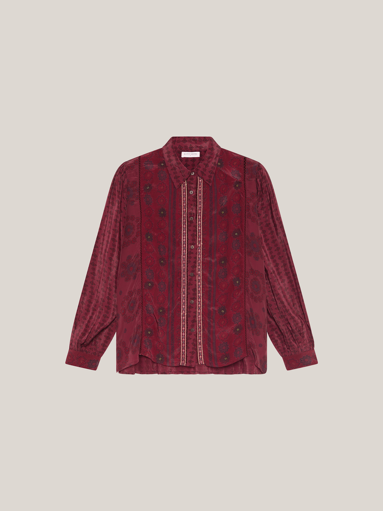 Emilie is a long-sleeve, button-down cut blouse, finished with subtle white piping details. Its print and texture add understated movement, while the softness of the fabric keeps it easy to wear.