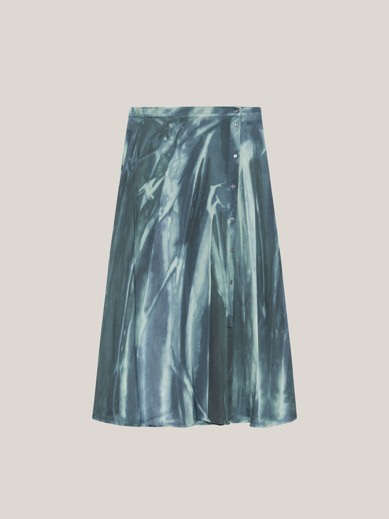Viscose marbled in blues and darker tones — a fabric that feels alive, almost stirred in motion. The wash creates a subtle relief, adding depth without weight. Each piece is shaped by a manual tie–dye process, making no two alike.