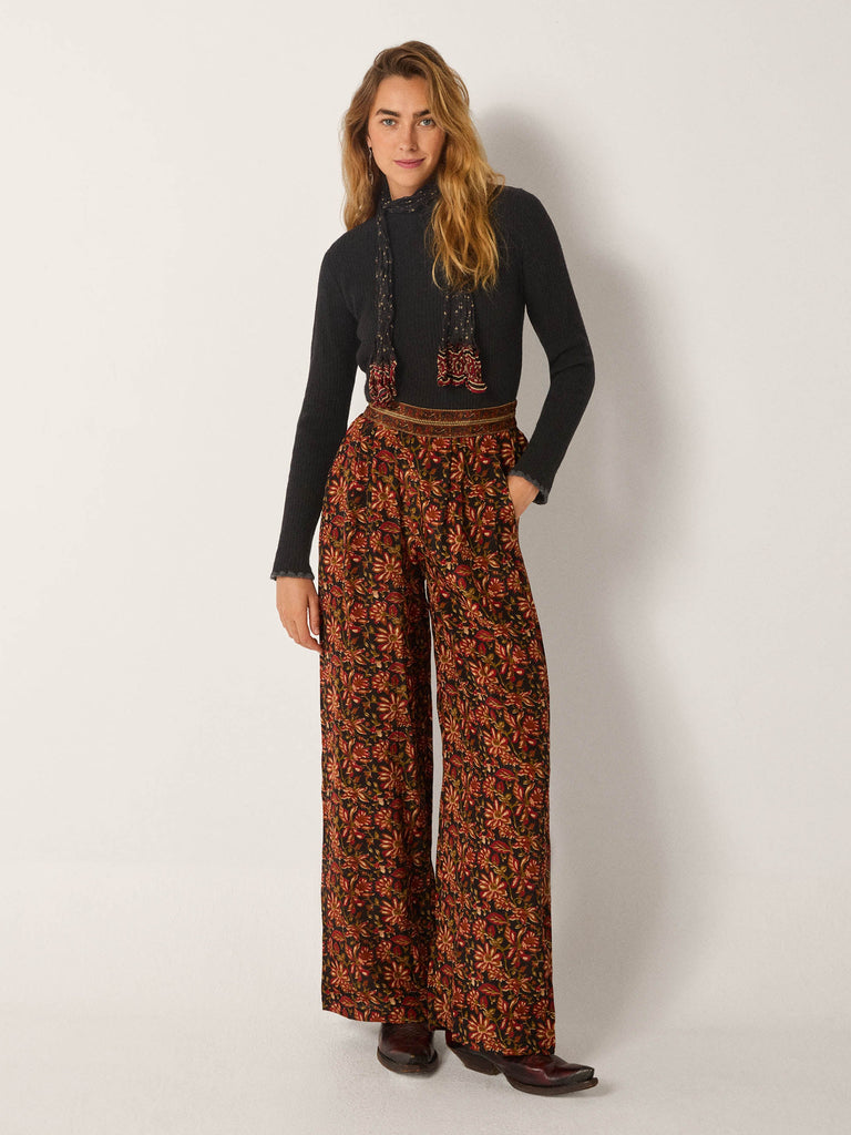 Viscose with weight yet loose enough to move. The print is a tangle of florals in burnt reds and ochres over black — more dive bar than garden, more backroom wallpaper than bouquet. It’s lived-in excess, like a Lou Reed lyric—where the night is velvet and jagged.