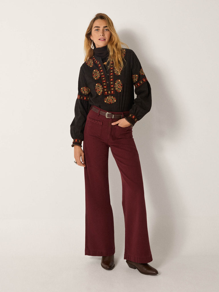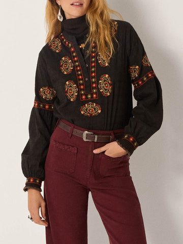 Crafted from lightweight cotton schiffly, the Bruna Blouse comes in black and is richly embroidered with chandelier–inspired motifs in deep red and gold. The placement runs across the chest, sleeves and cuffs, giving the piece a bold, ornamental character.