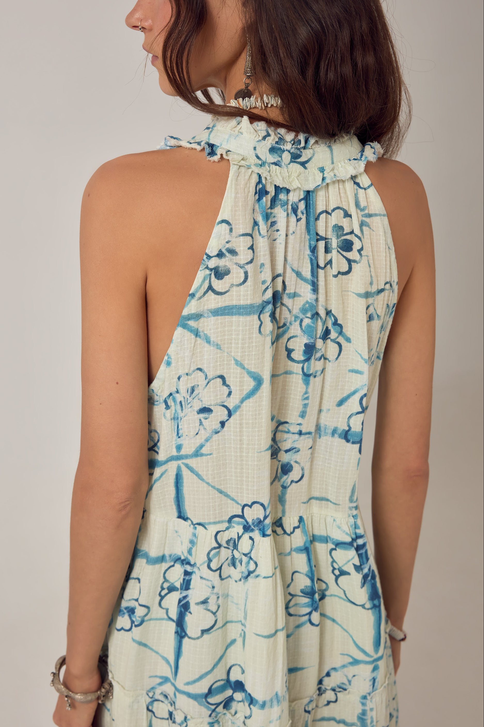 Sleeveless cotton maxi dress in warm ivory with a watercolour floral print in washed teal and blue — large blooms and geometric tie-dye-like marks that feel hand-painted and slightly abstract.