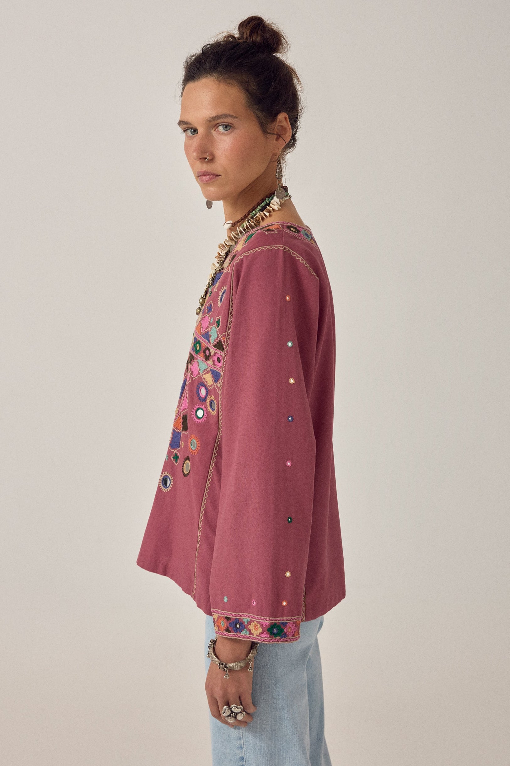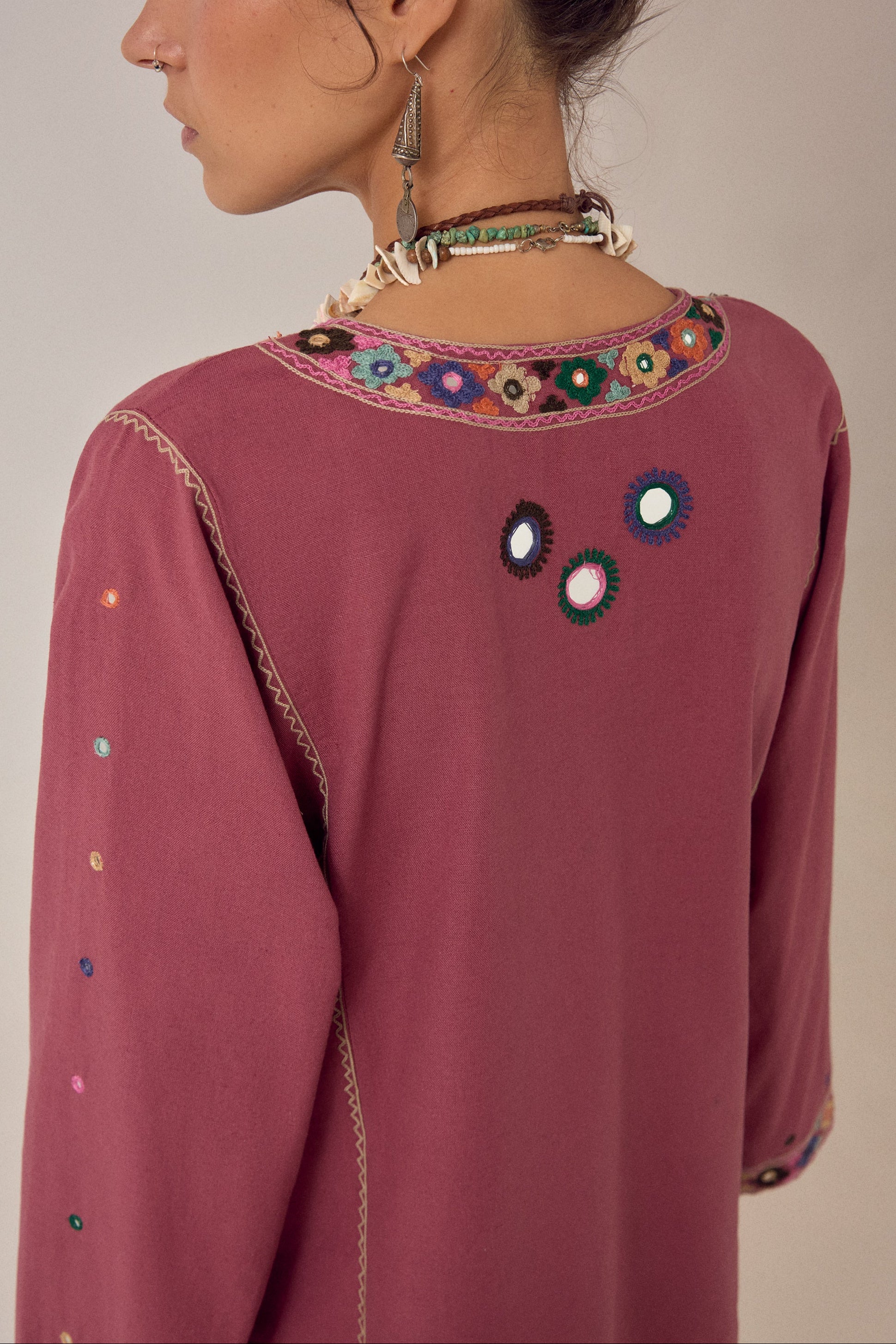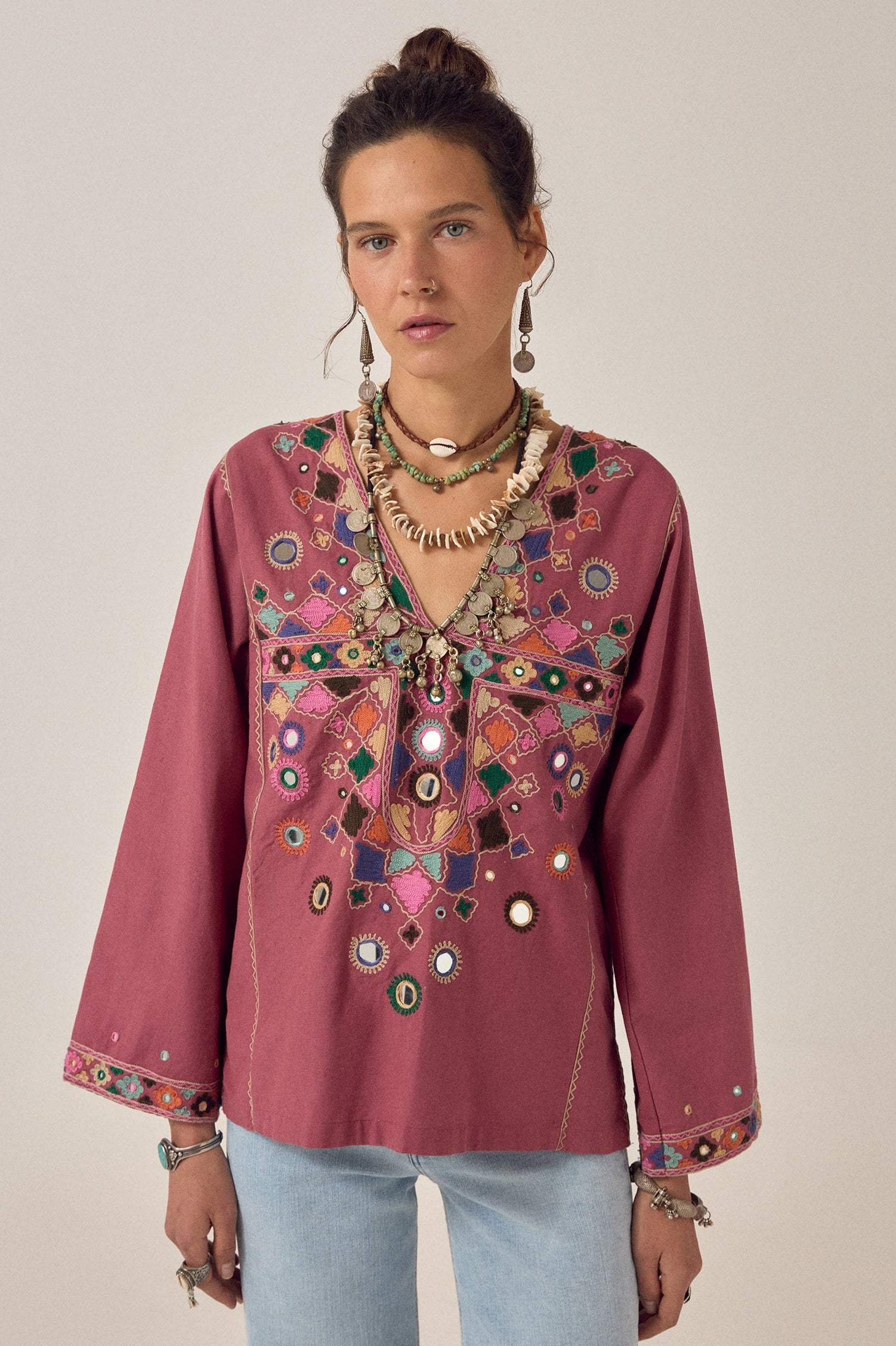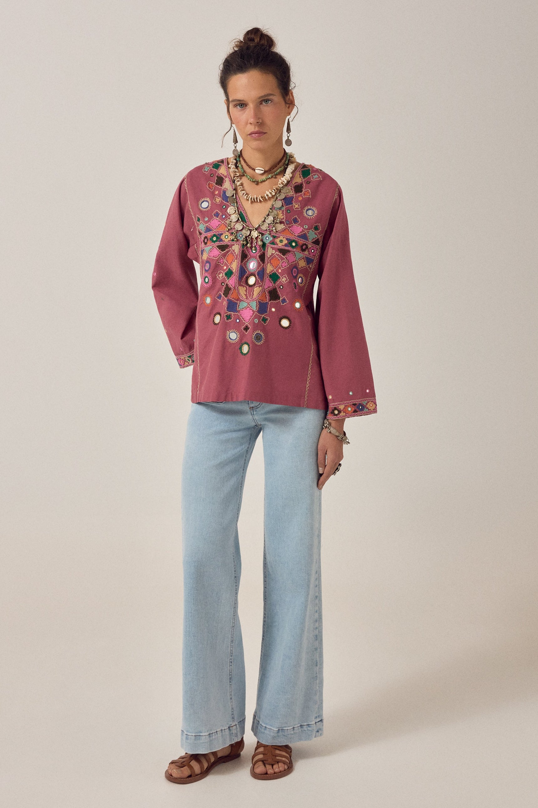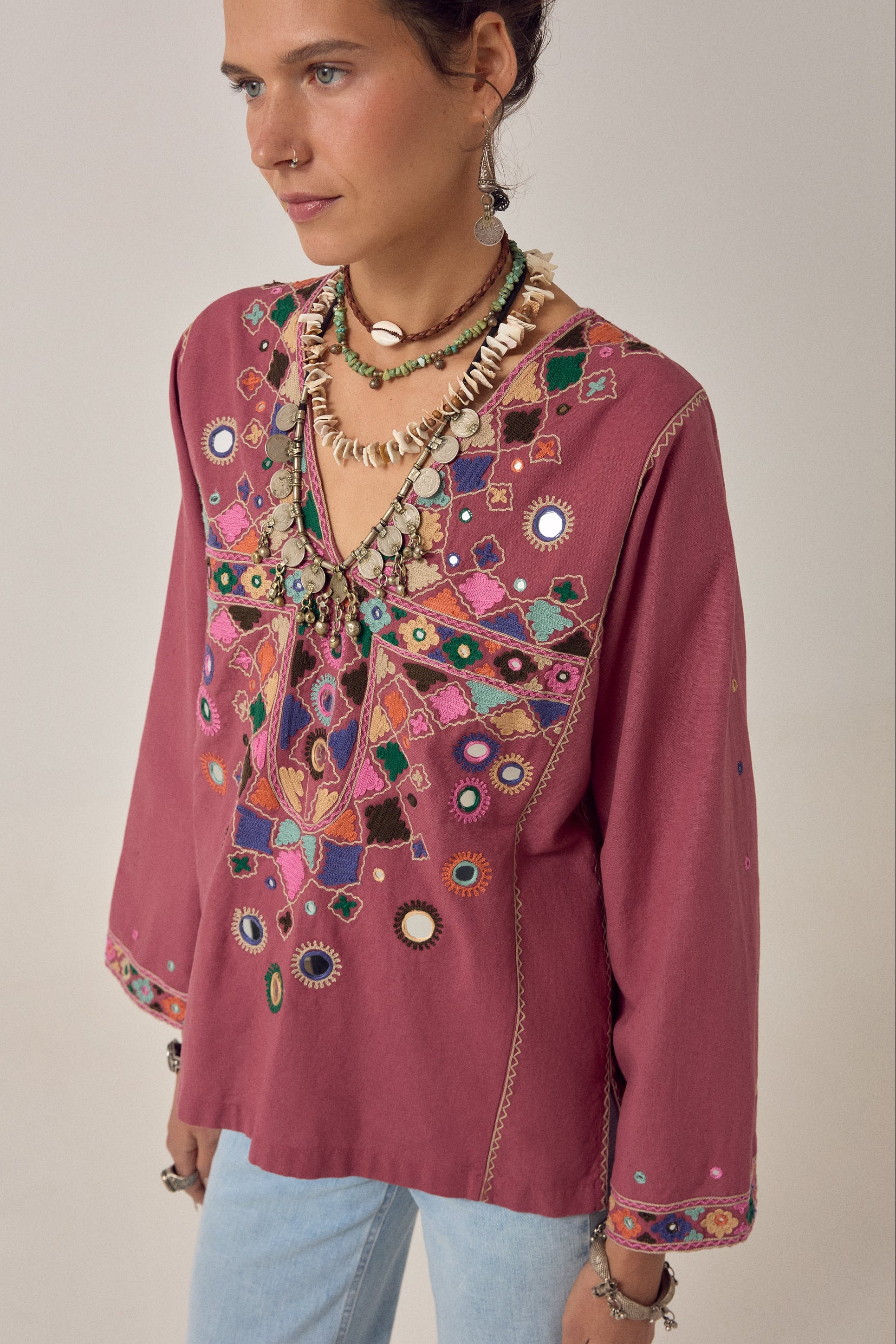 The embroidery fans out from the neckline down the chest like a breastplate.