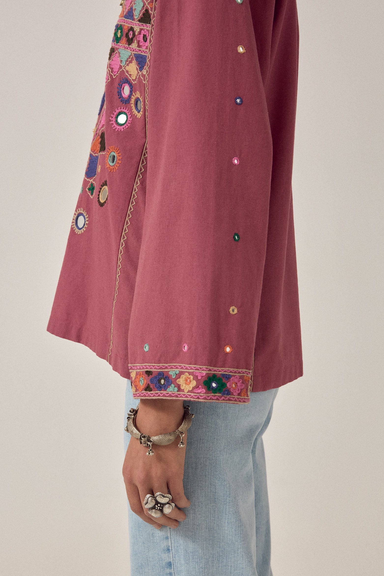 The front is covered in a dense Rajasthani-inspired patchwork — geometric diamond and circular motifs in multicolour thread across orange, teal, purple, green and ochre, with large and small mirrors embedded throughout.