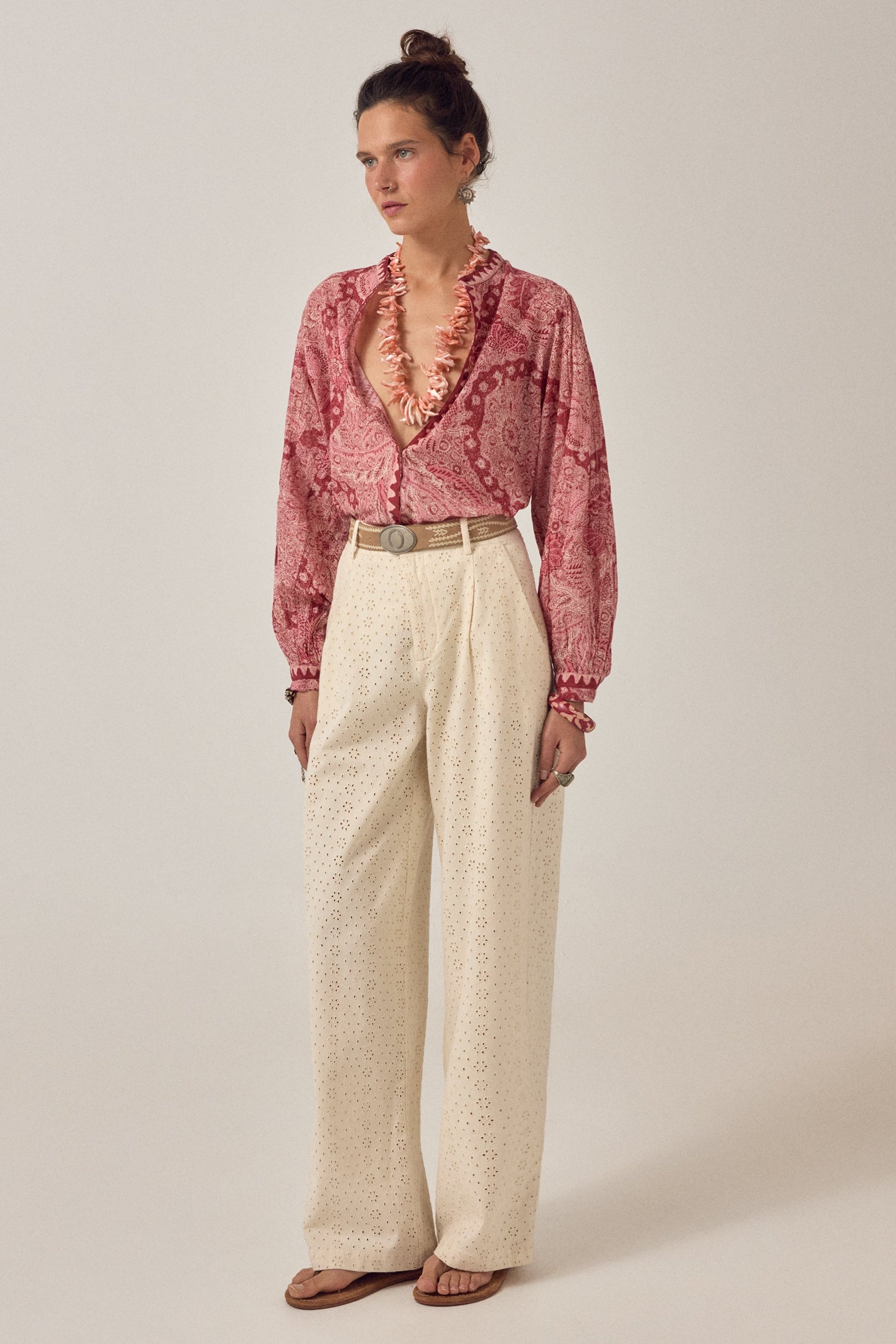 Cotton blouse in warm red with a dense Java pattern — swirling paisley and floral motifs in deep garnet and dusty rose.
