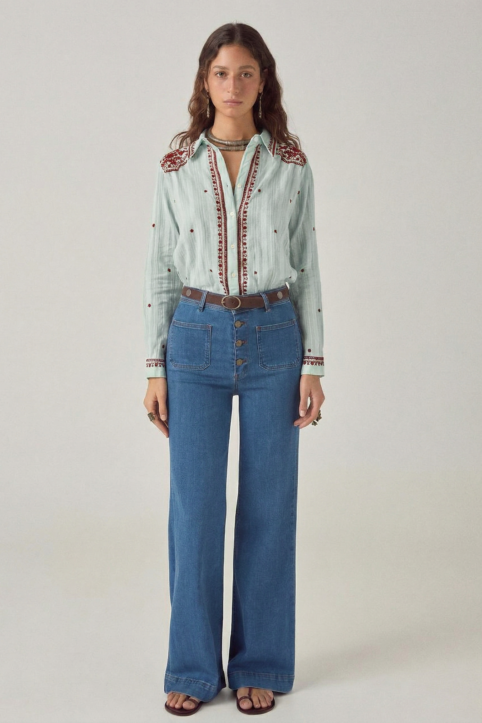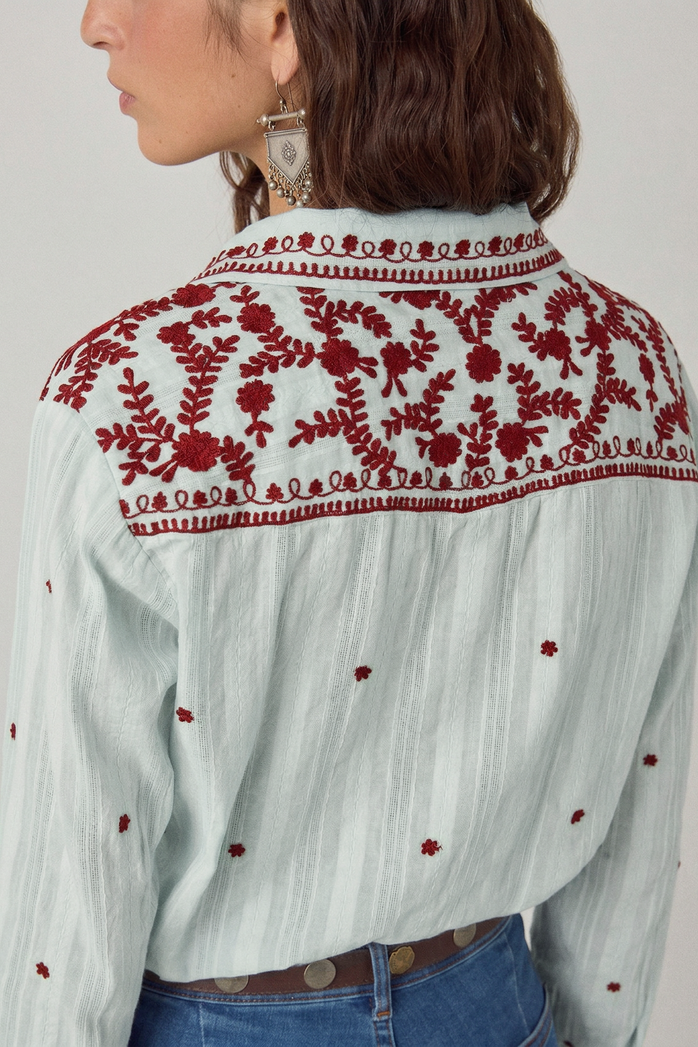 The embroidery is concentrated at the shoulders and front placket, which frames the shirt without covering it.