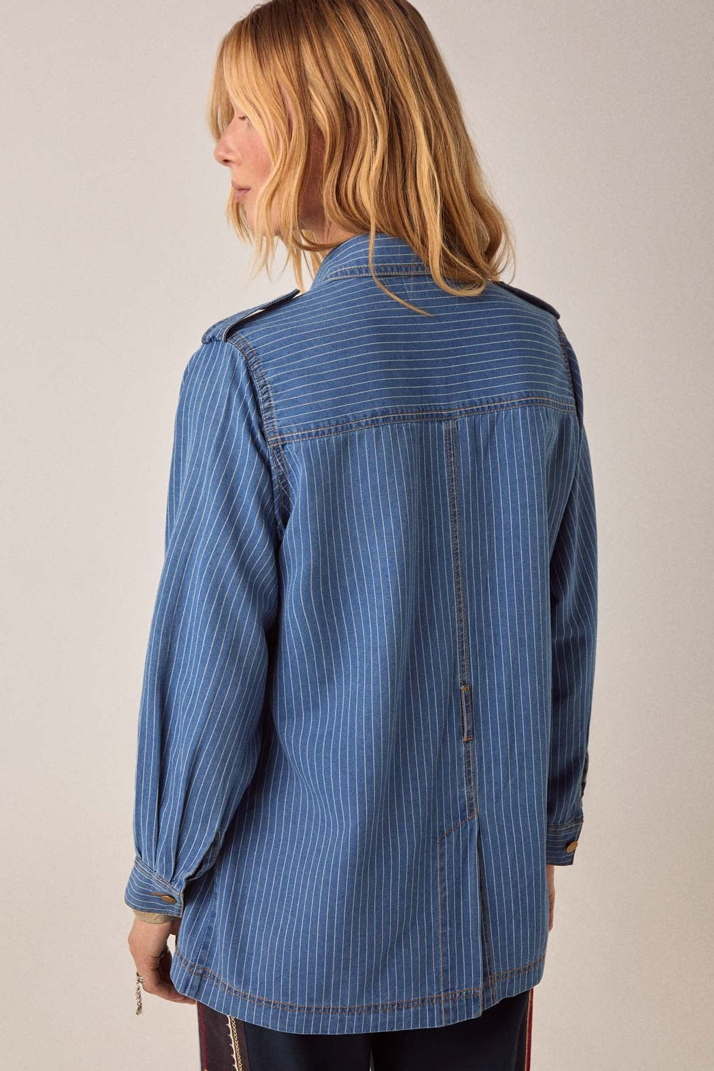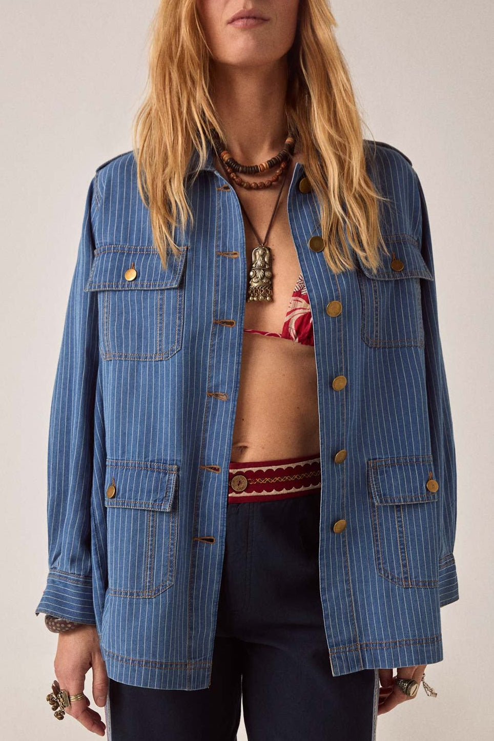 A fabric tie at the waist lets the silhouette shift — loose and open, or gently shaped. Patch pockets and metal buttons nod to workwear, softened by the lightness of the fabric and the relaxed cut.