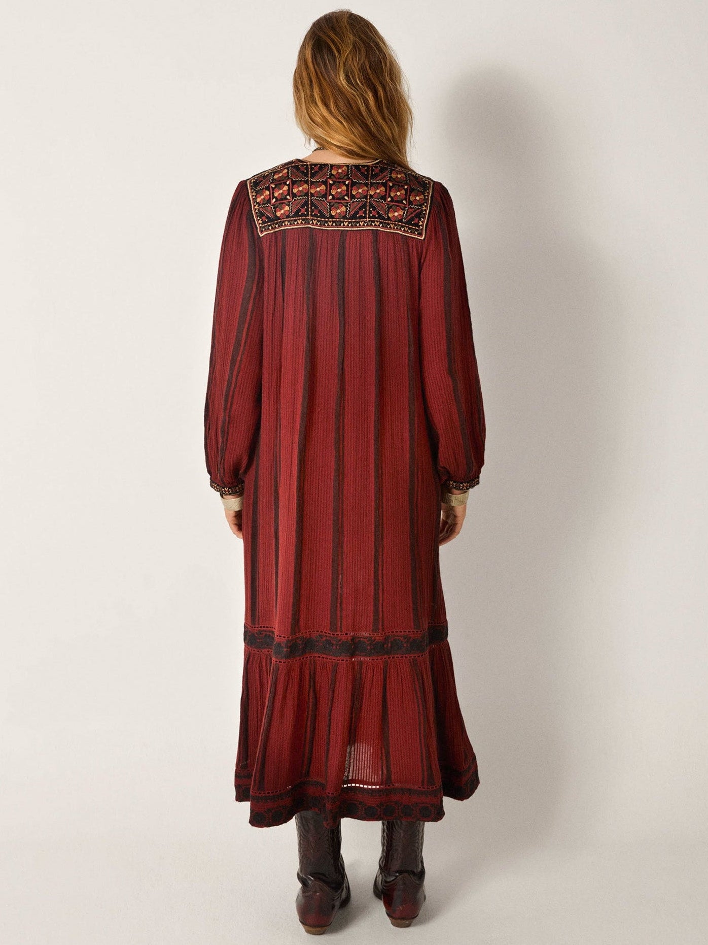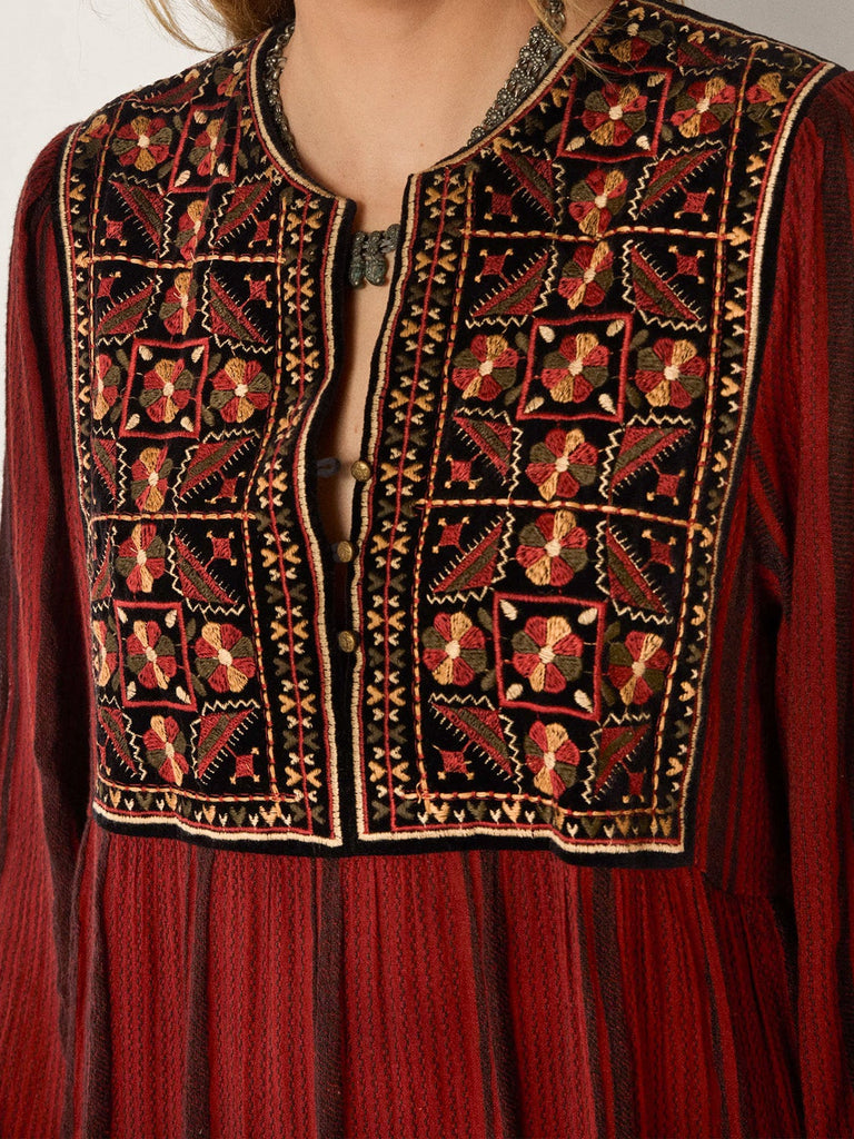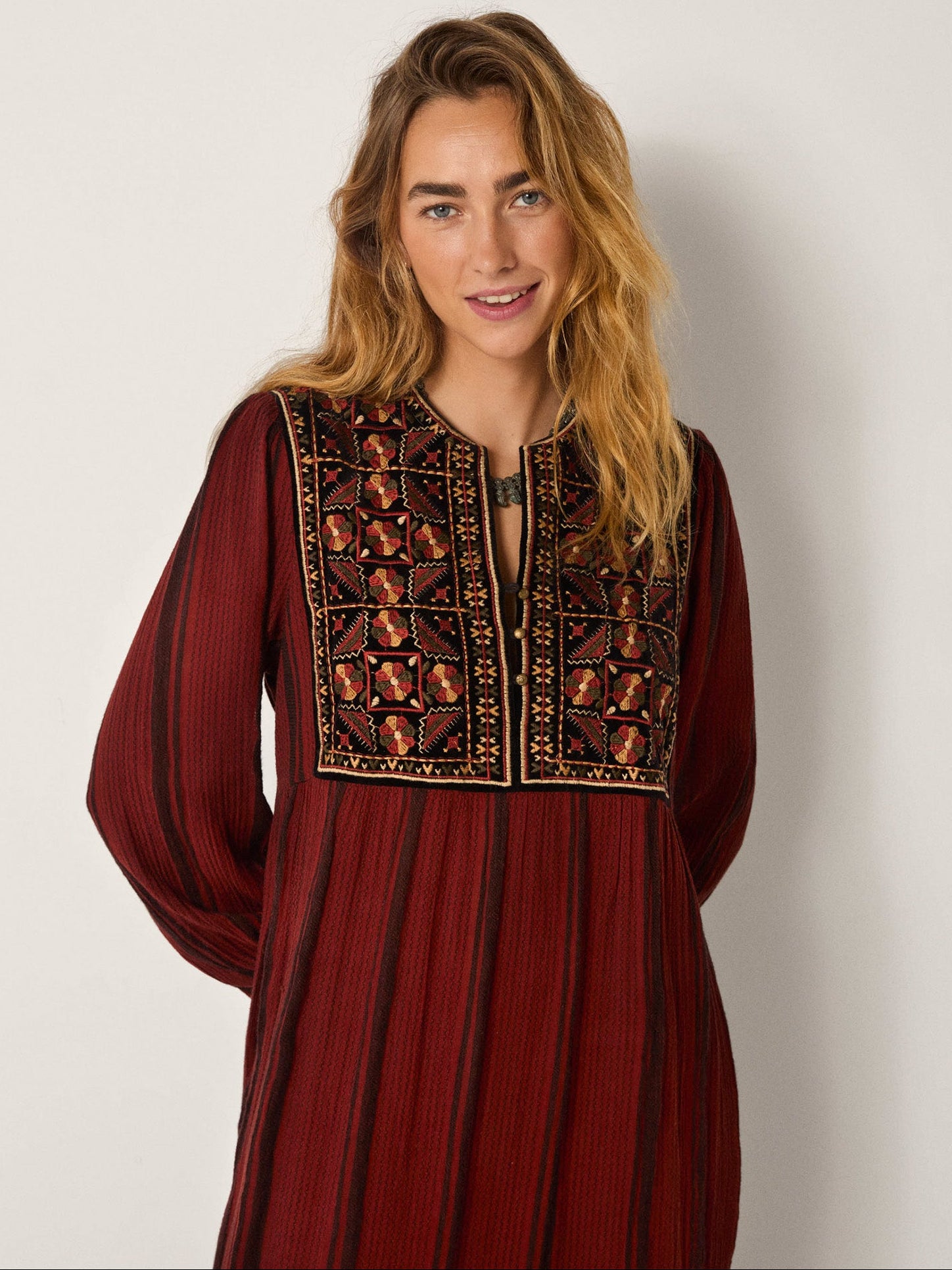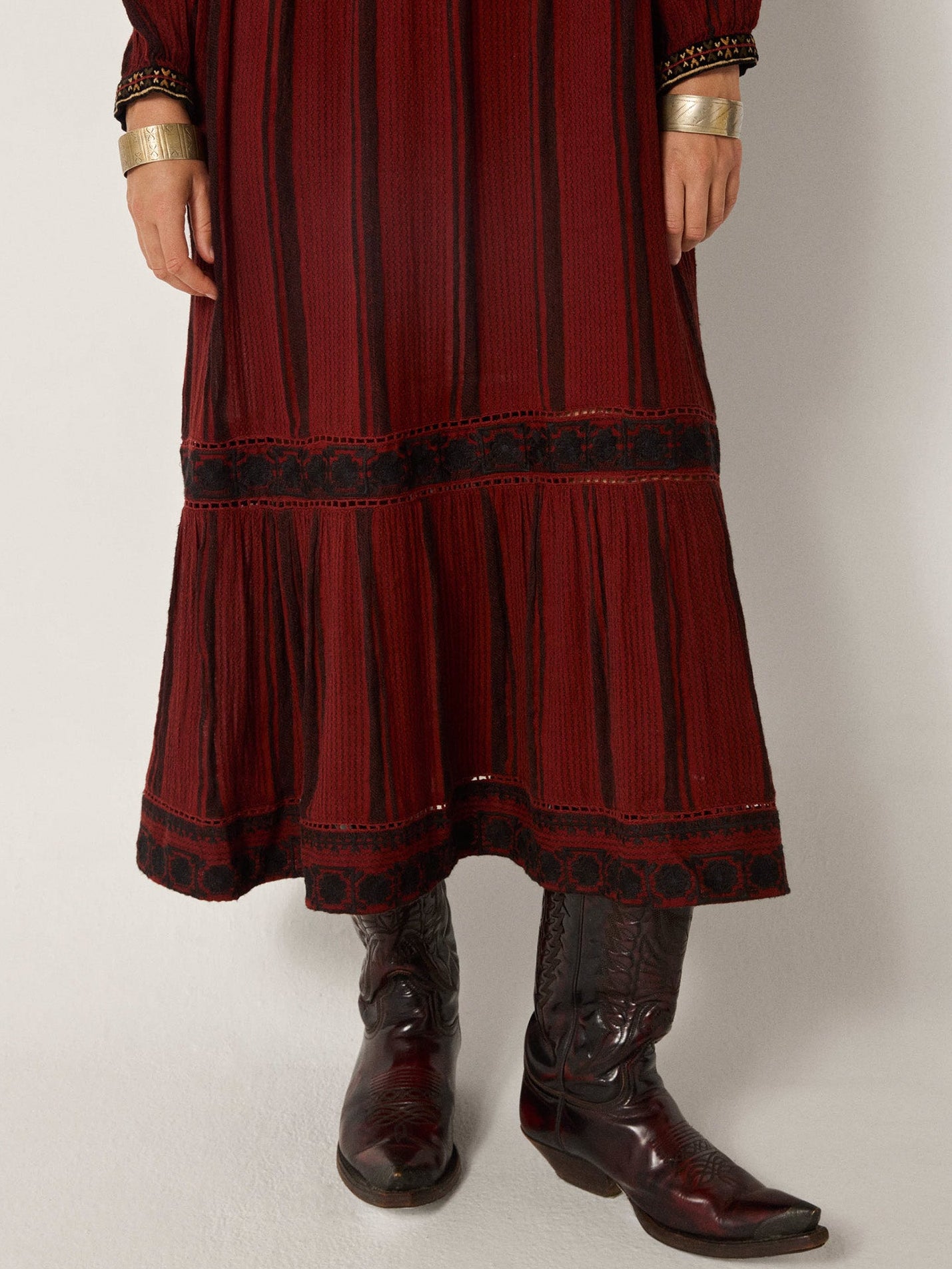 A deep saffron base woven with tonal stripes, cut long and loose. The chest is framed by square embroidered panels in red, black and gold — folk geometry stitched dense, like protective talismans worn across the body. The fabric, 100% cotton yard dye, itself carries texture, with bands of lace inserts breaking the fall of the skirt.