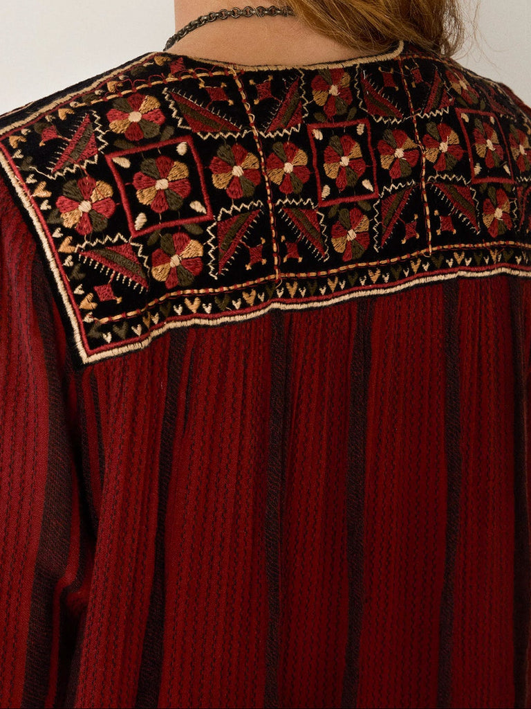 The silhouette is straight and generous, sleeves full, neckline open but anchored by the weight of embroidery. It feels ceremonial and lived-in at once — a piece that bridges memory and mischief, echoing the Smashing Pumpkins’ way of turning nostalgia into something electric.