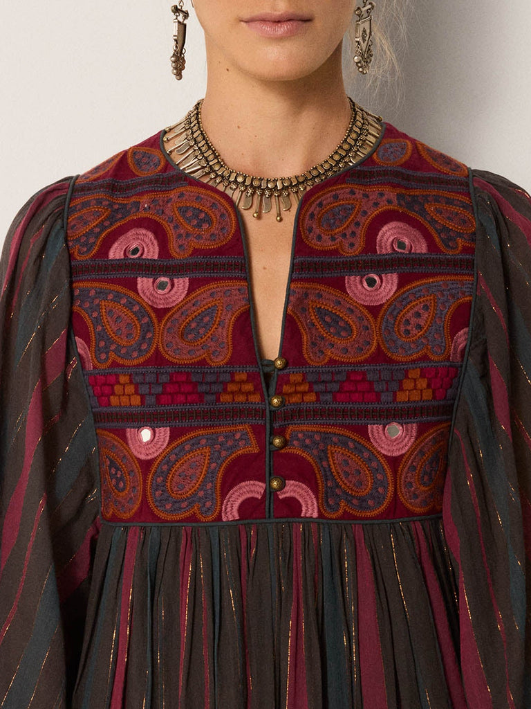 Alternating stripes of burgundy, charcoal, and muted gold run across the body, while jewel–toned embroidery frames the neckline in precise motifs. The long sleeves add further balance to the flowing design.