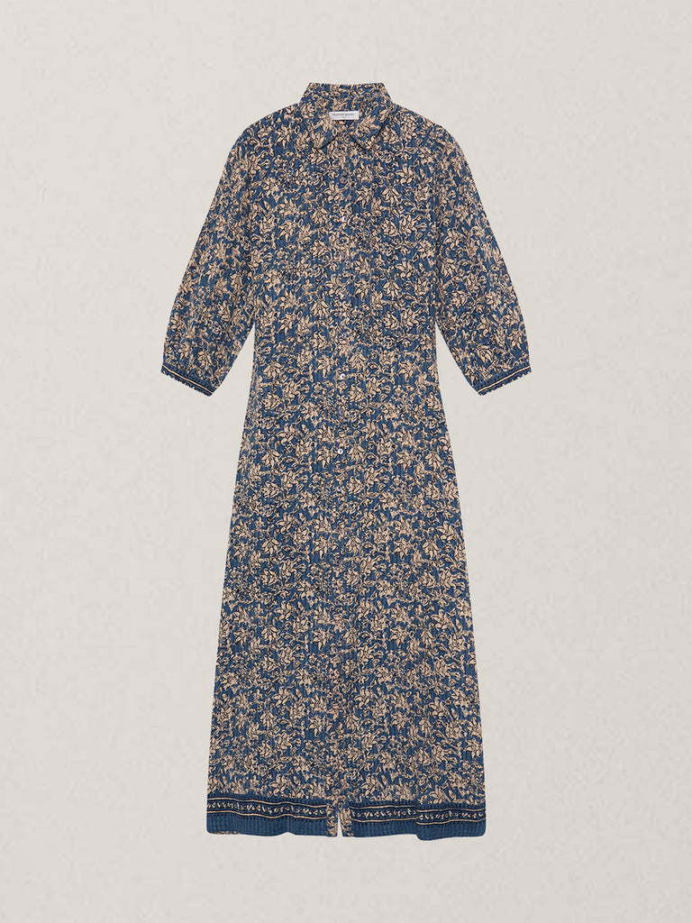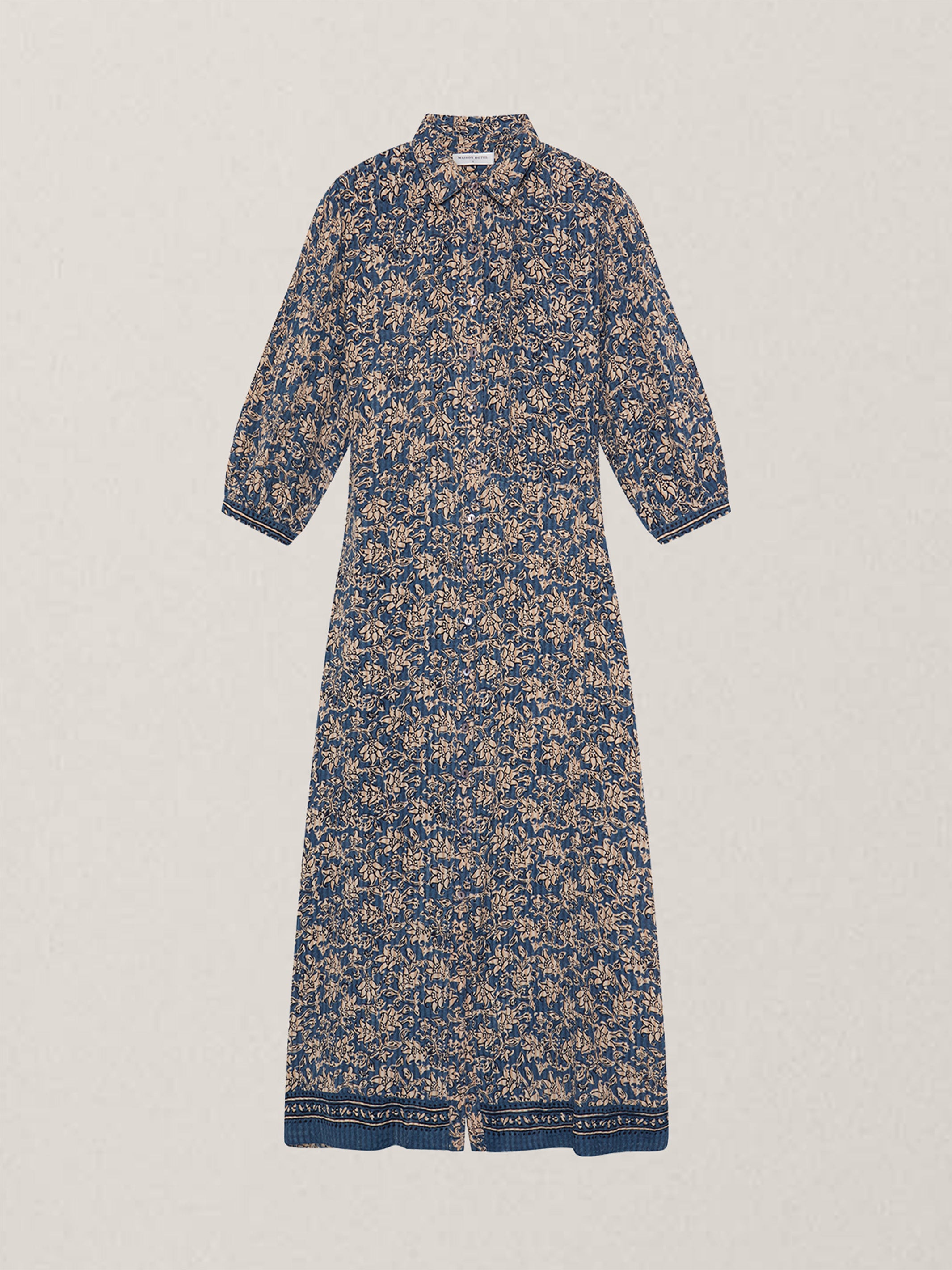 Viscose printed dress in muted teal with sand–colored florals, bordered at the hem and cuffs with a narrow trim that frames the shape. The fabric is light with natural drape, moving fluidly while holding its line.