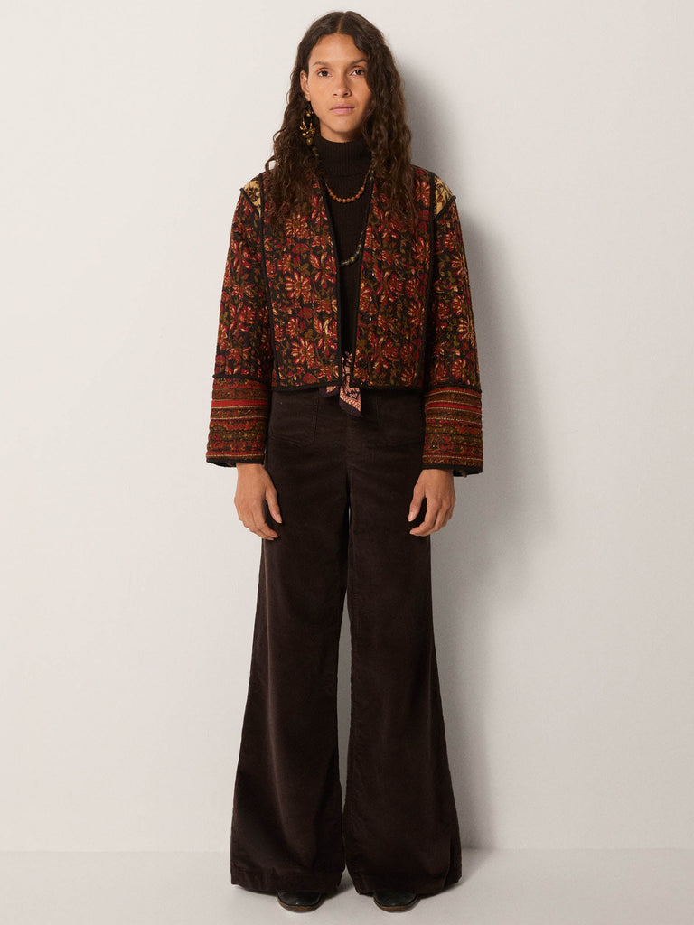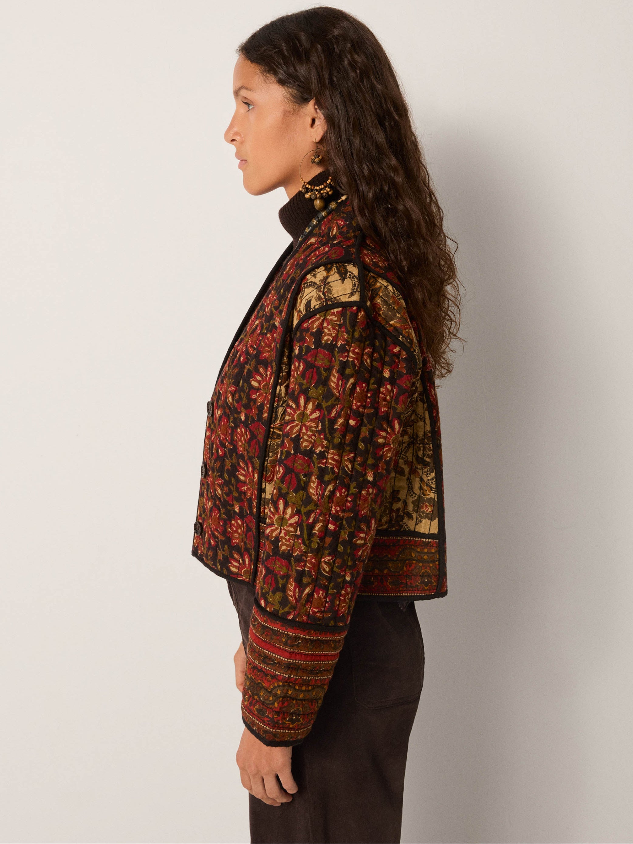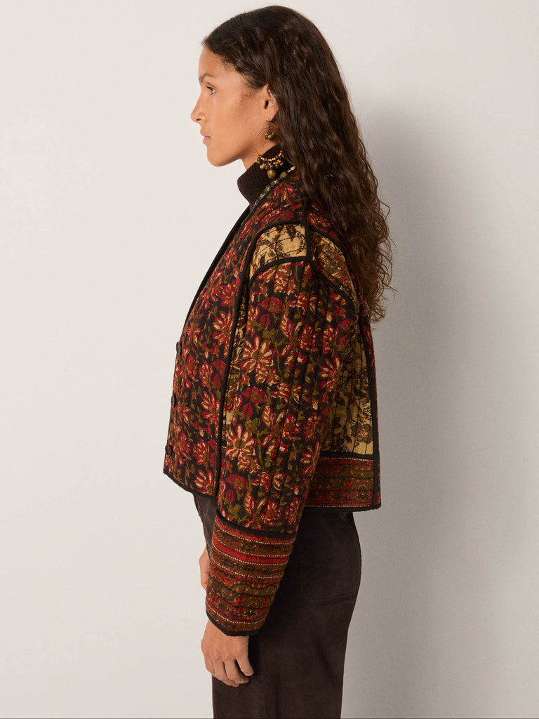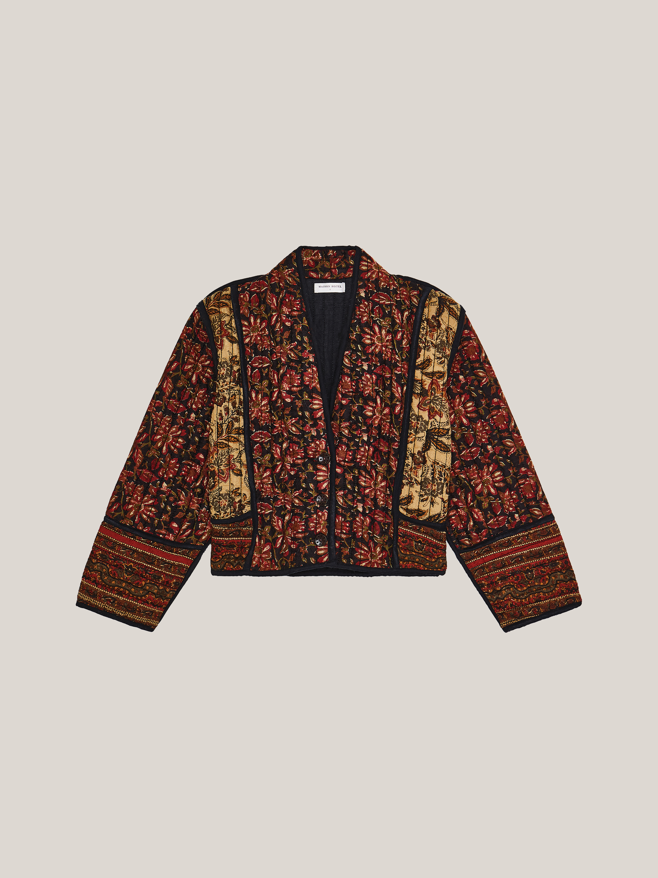 Cut in cotton dobby with a quilted hand, the jacket feels warm yet not heavy, light enough for layering. Its surface holds printed florals in deep red, green and gold.