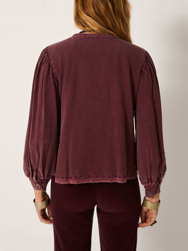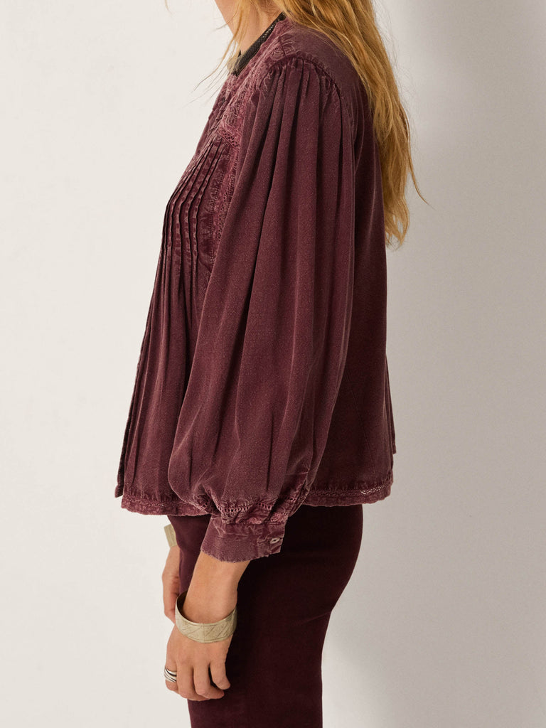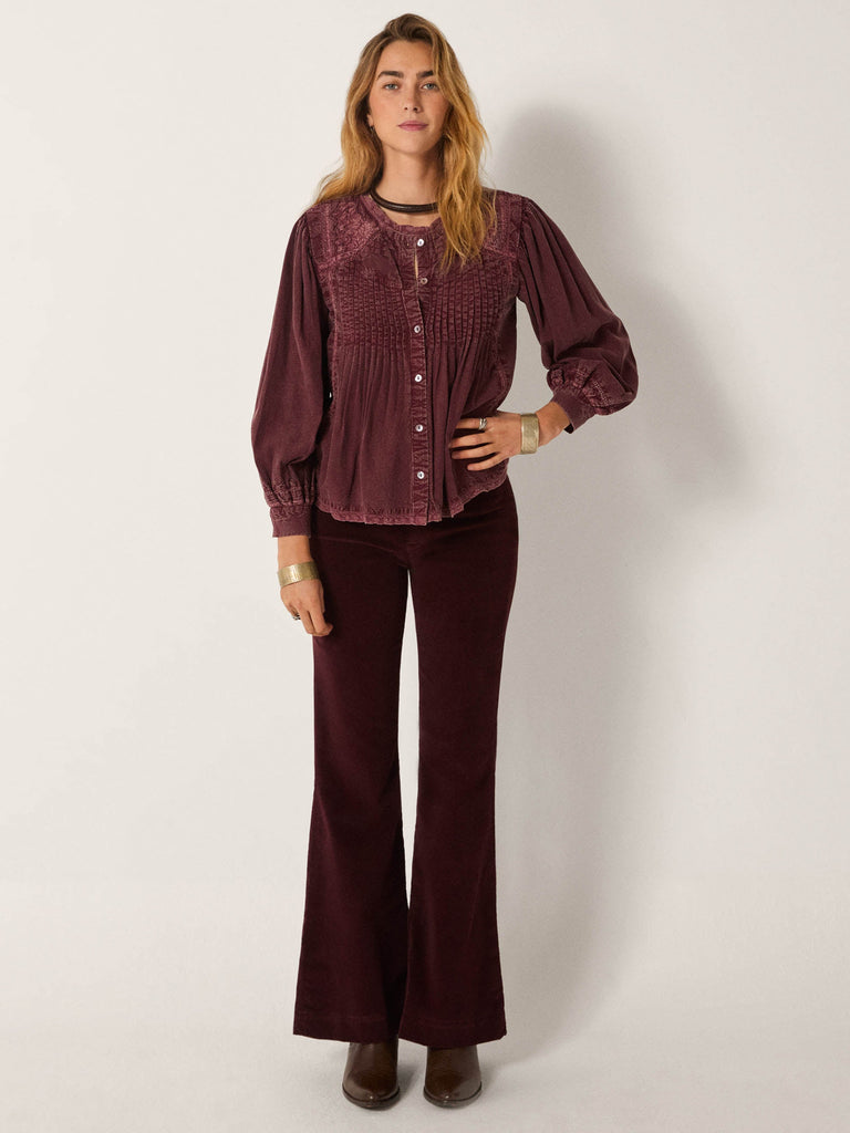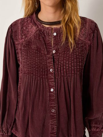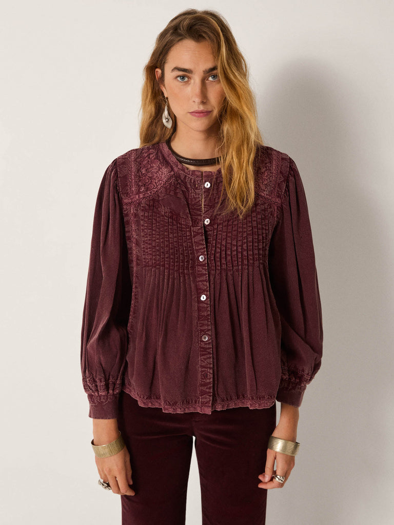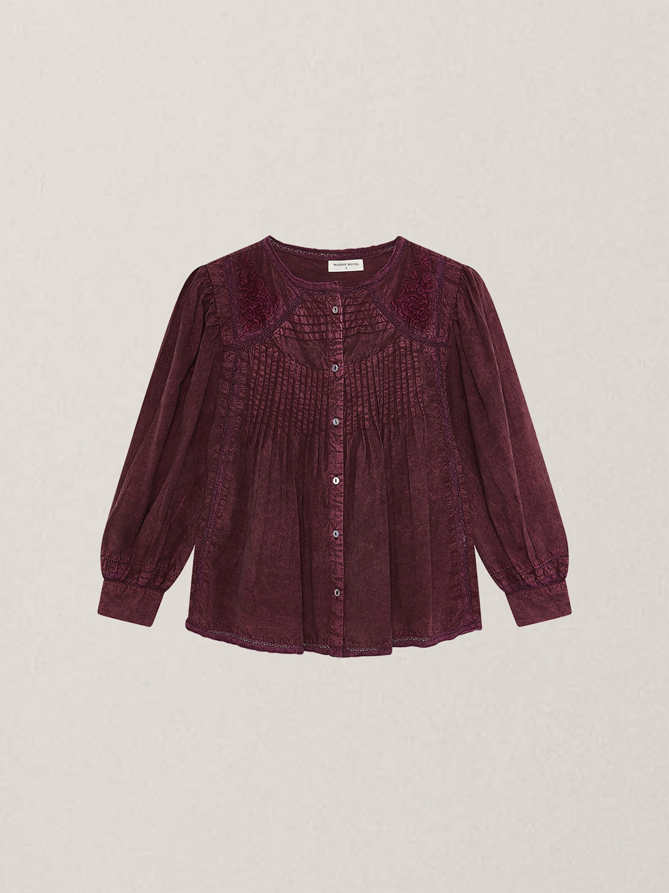 The yoke is traced with tonal embroidery, while fine pleats run down the front before opening into soft volume. Sleeves are cut full, cuffed at the wrist, the hem slightly gathered to sit easy at the hip.