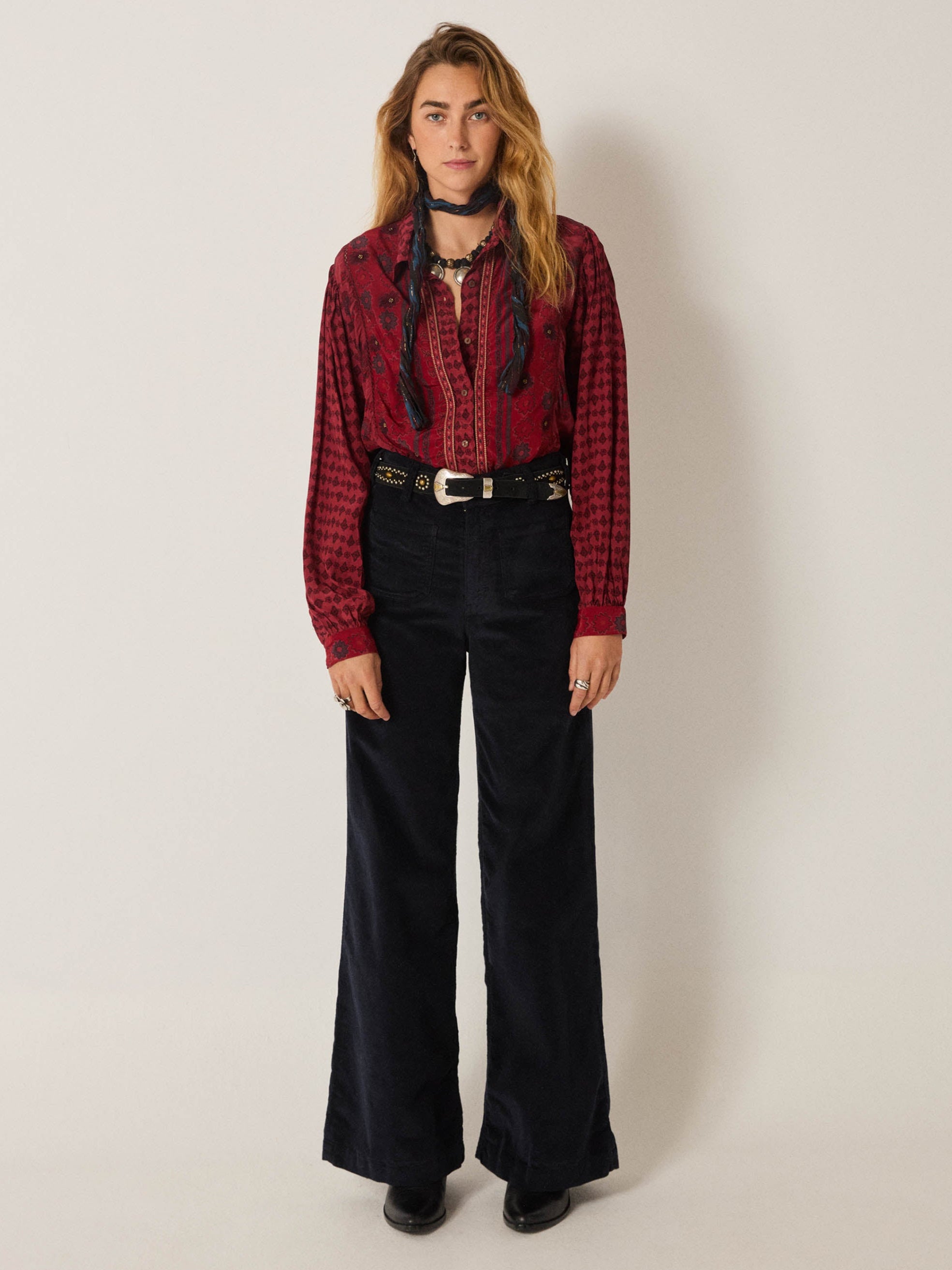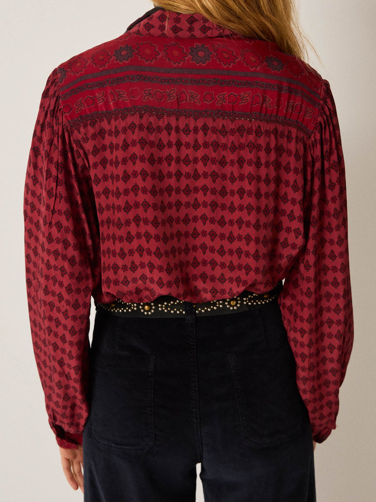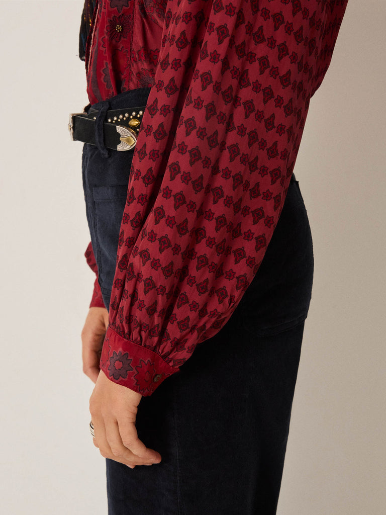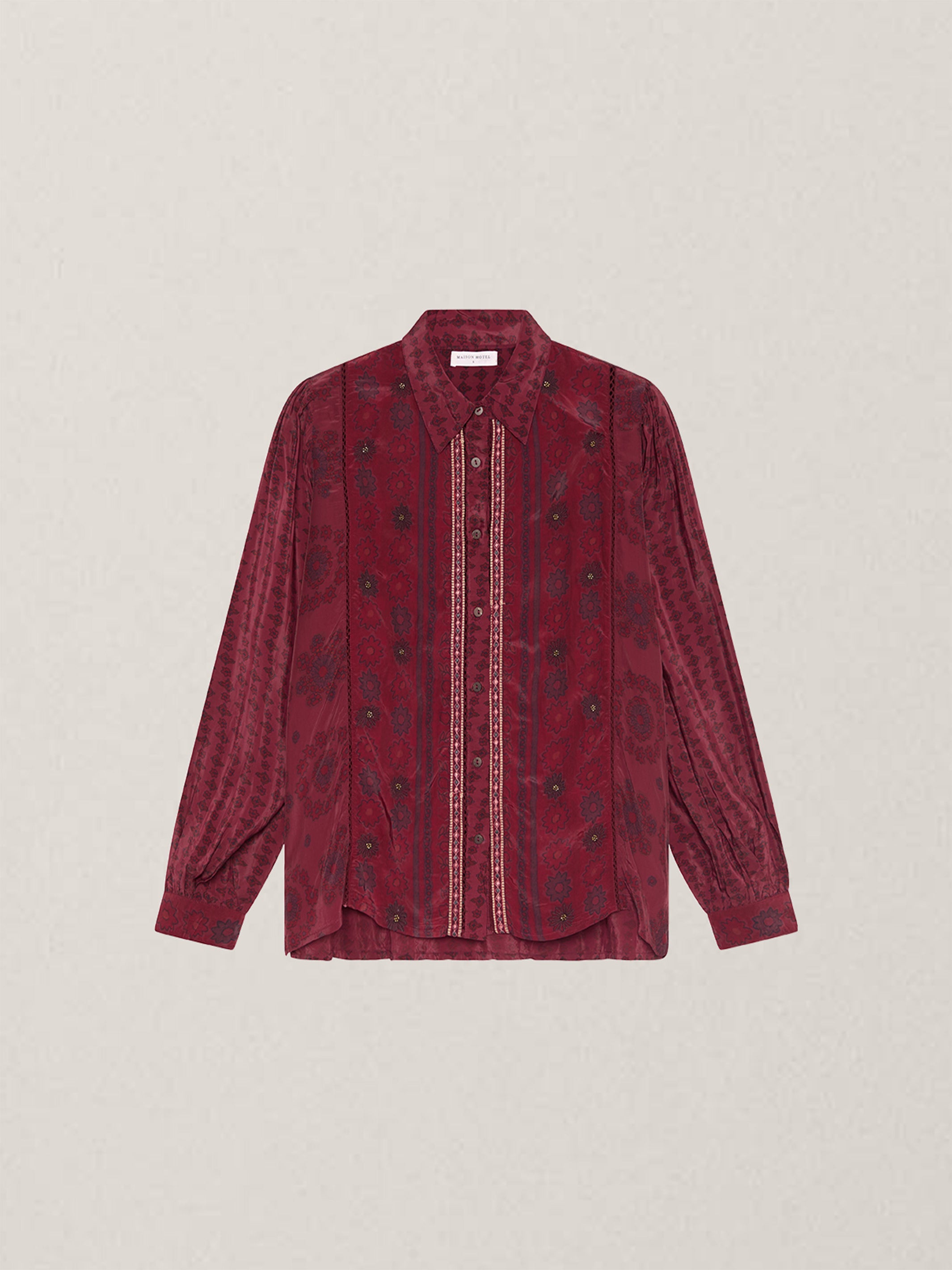 Emilie is a long-sleeve, button-down cut blouse, finished with subtle white piping details. Its print and texture add understated movement, while the softness of the fabric keeps it easy to wear.