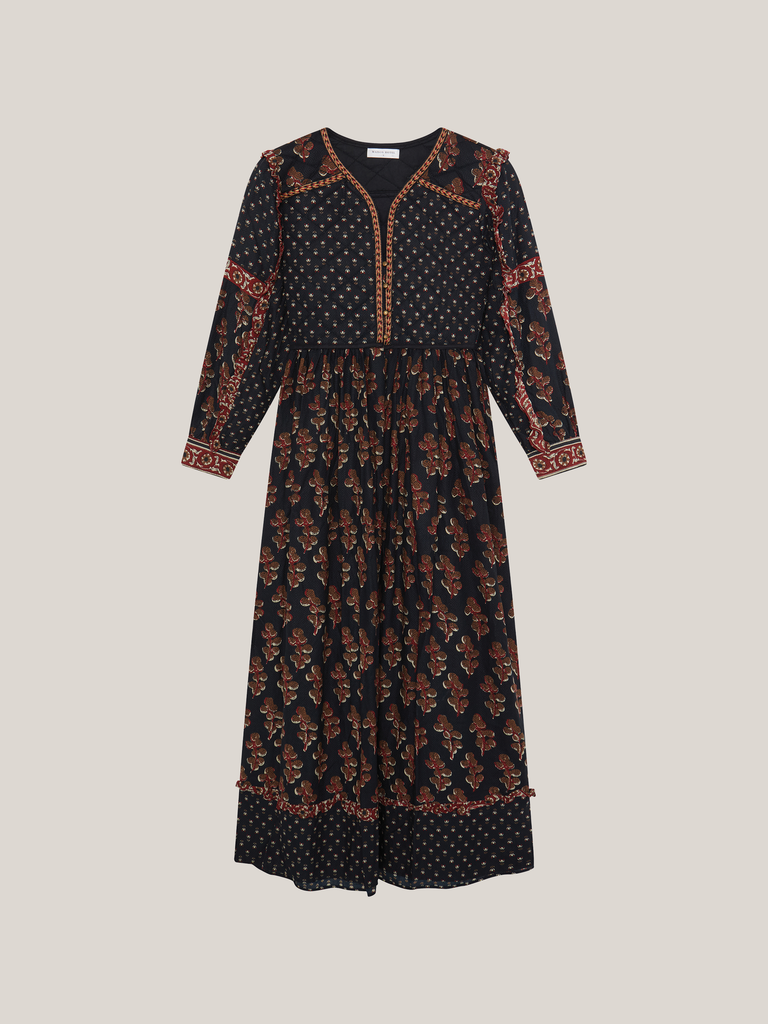 Cut in lightweight viscose dobby, the Lily Dress is where ease meets intricacy. Its flowing silhouette is fully adorned with prints that play across the dark ground, giving it movement, depth, and an unmistakable bohemian edge.