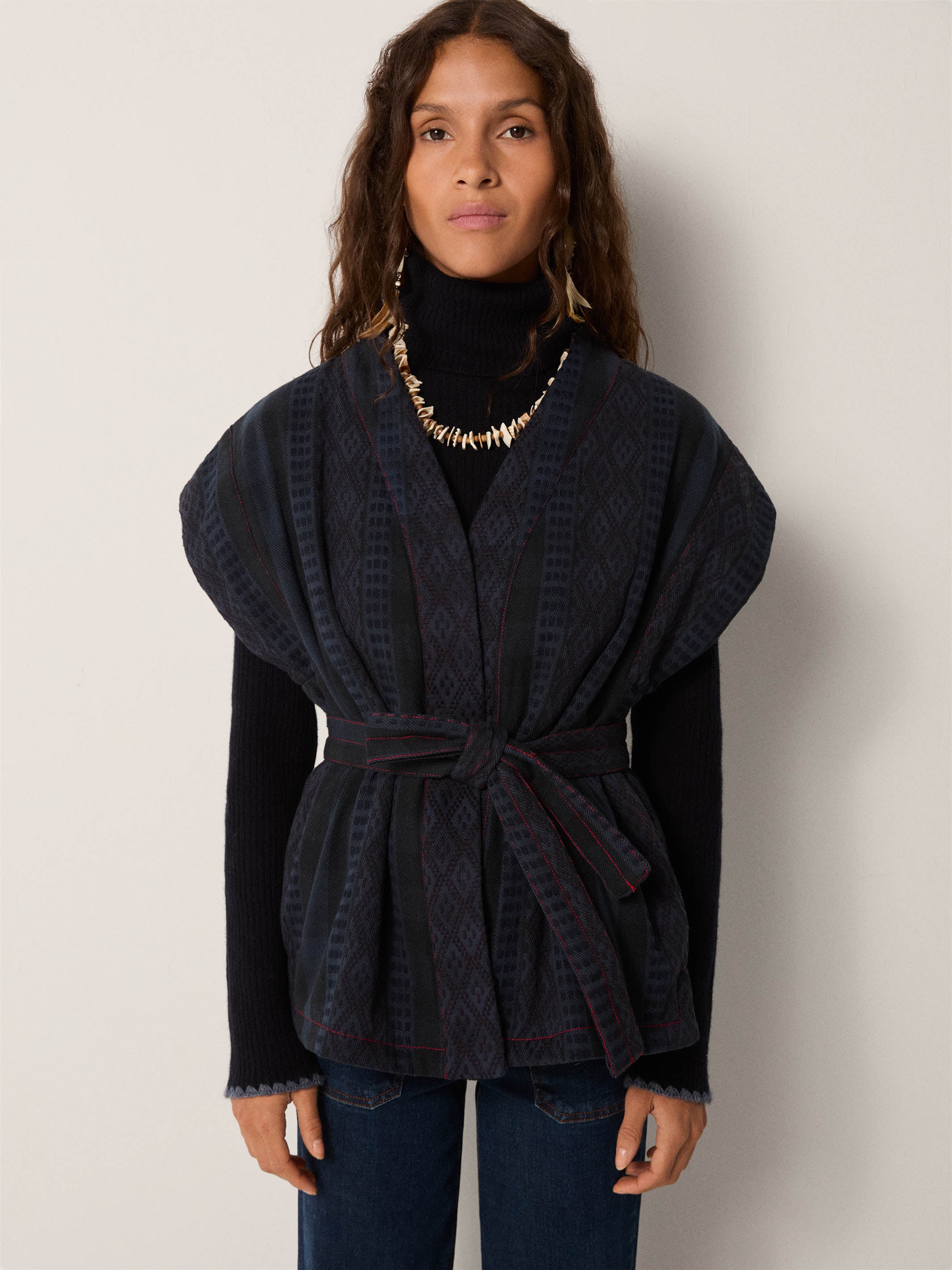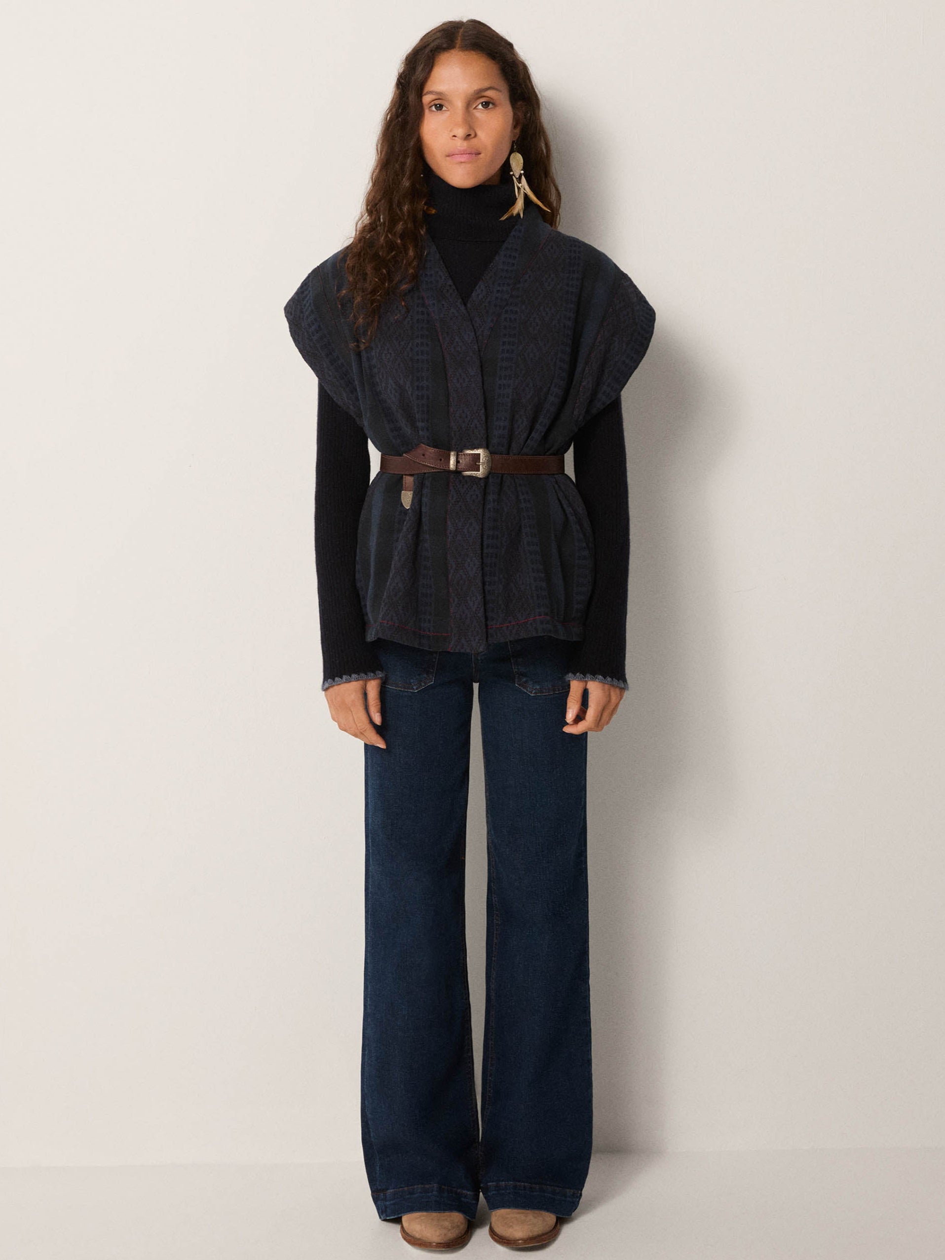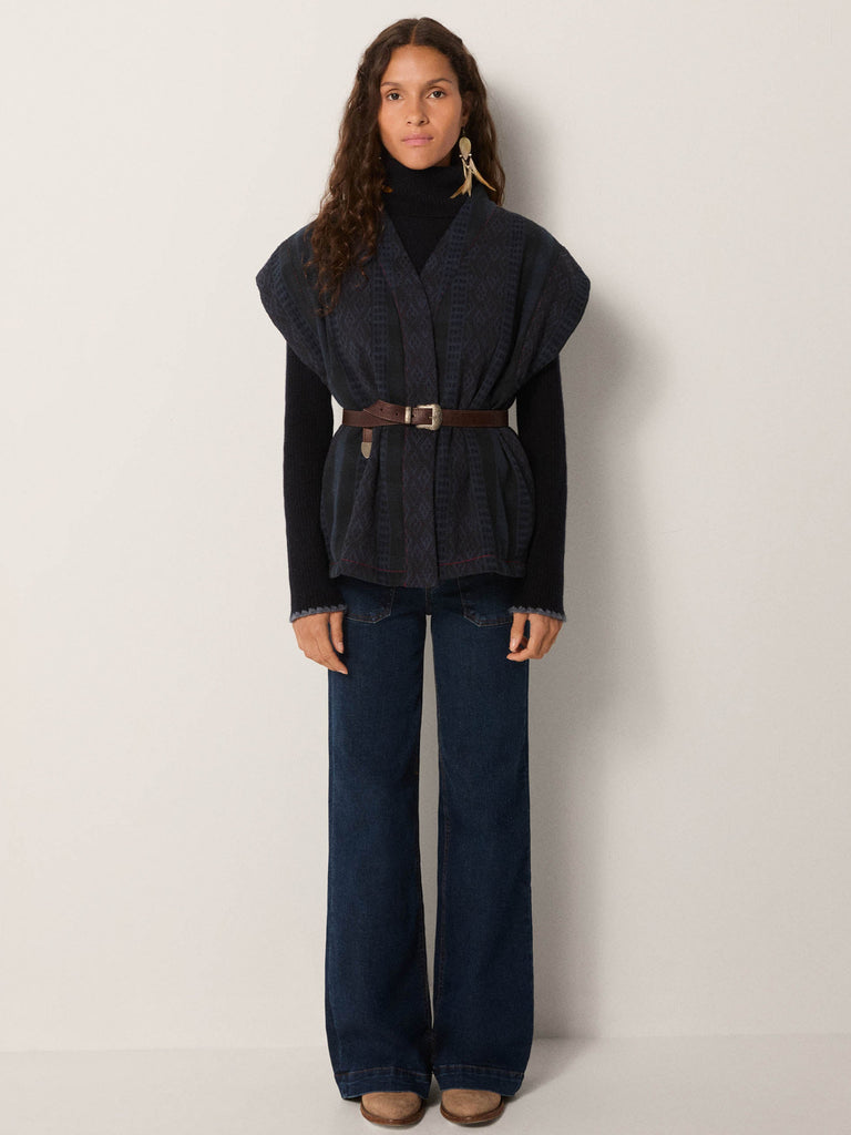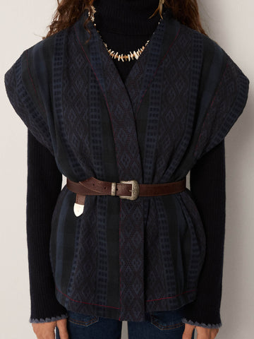 Styled over the Dolcevita Navy turtleneck and Clyde pant dark denim, tied with a Dakota Brown belt, the result is striking yet understated. It also works well layered over flowing dresses, where it adds definition and texture without weight.