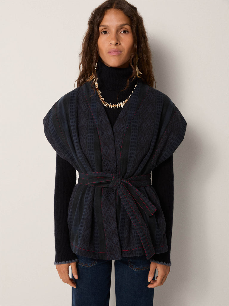 Crafted in cotton handloom, this vest brings heritage craft into a contemporary form. The deep navy diamond weave feels textured and substantial, while the cut remains fluid.