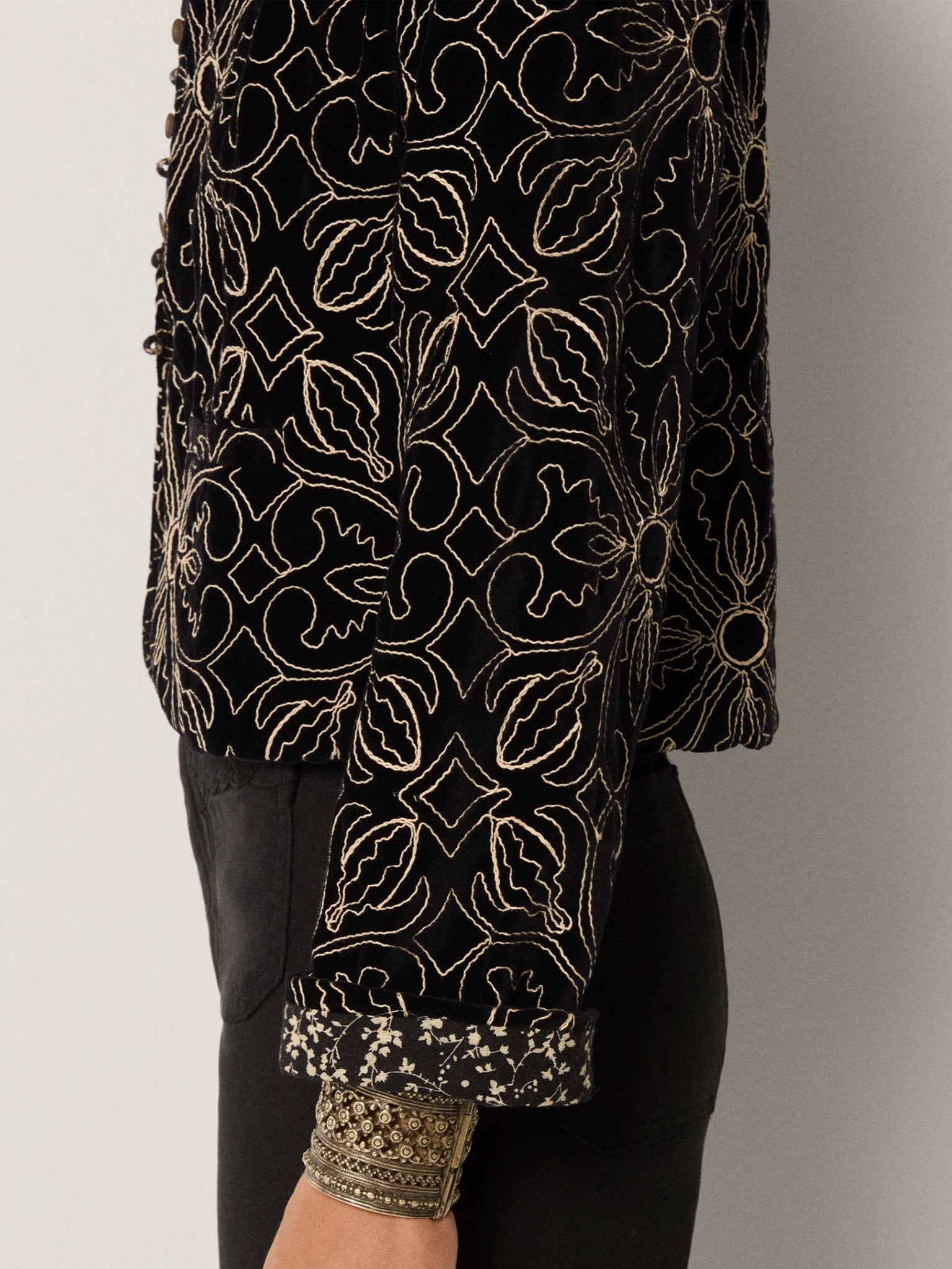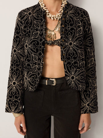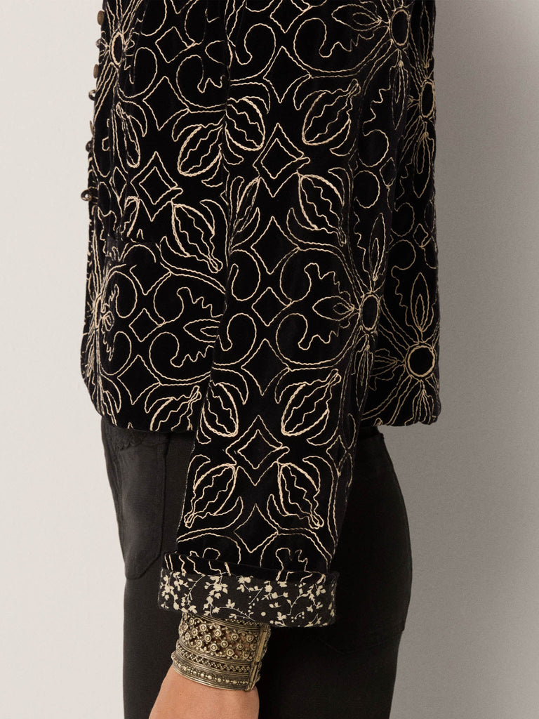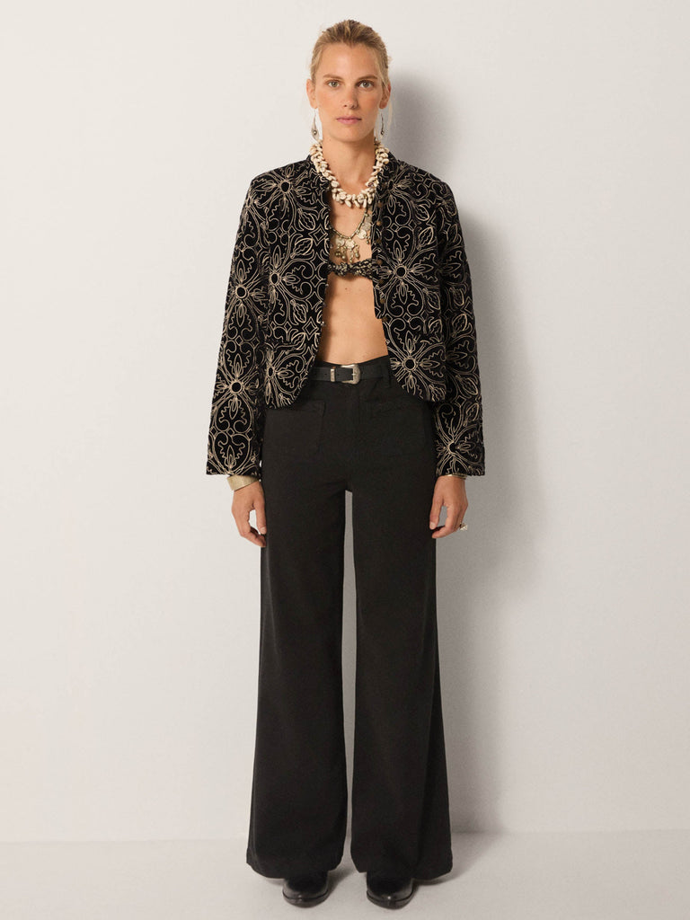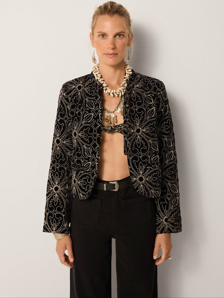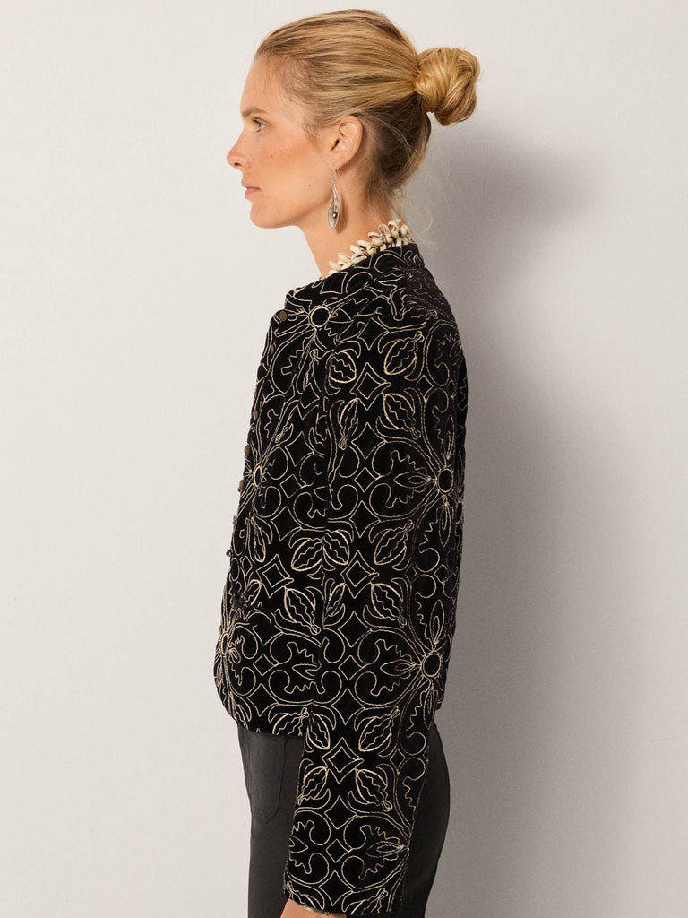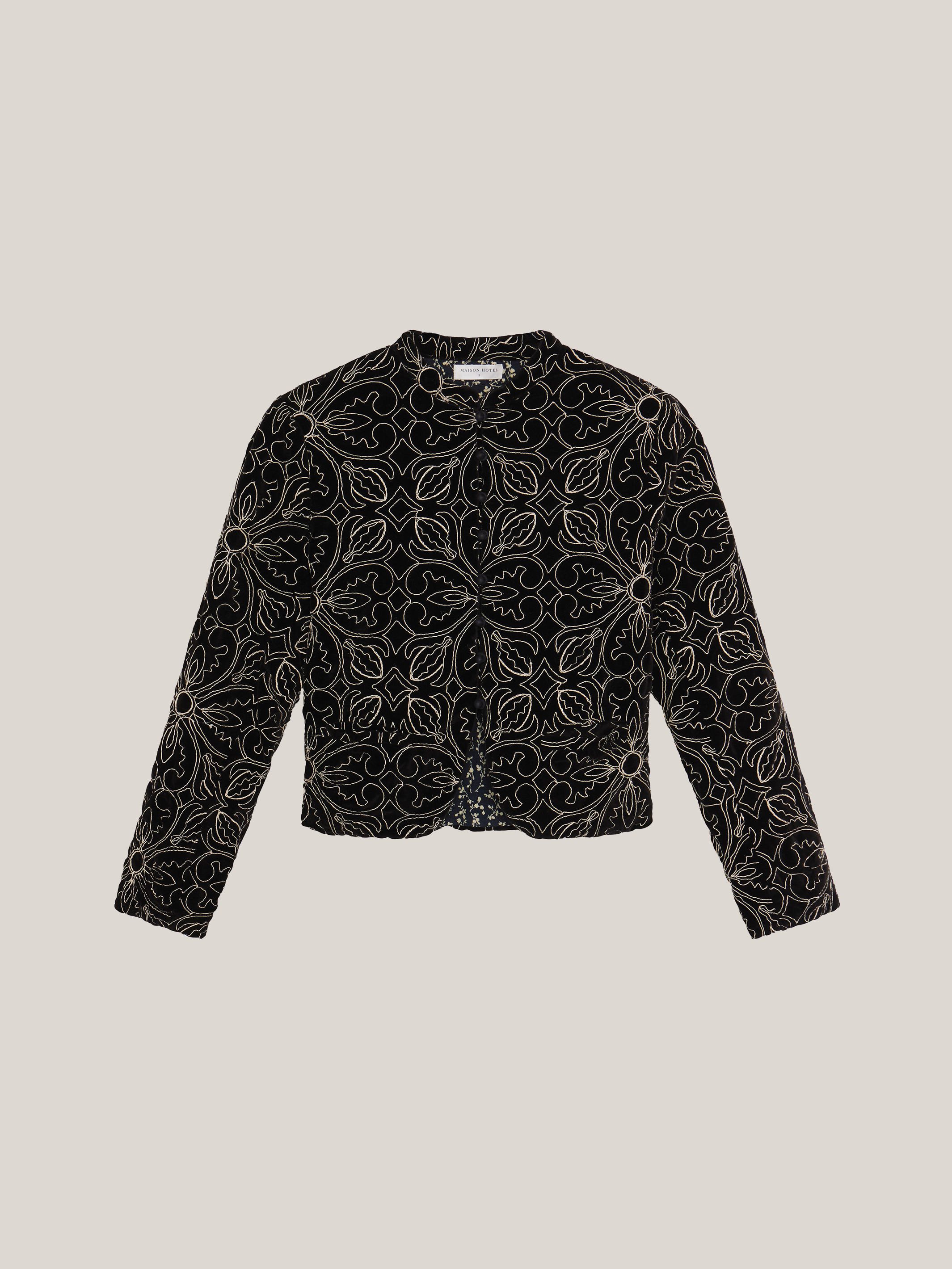 Velvet with weight, fully embroidered in golden metallic thread. The pattern runs bold and ornate, like something lifted from a baroque tapestry and cut into a jacket meant for the night. There’s a touch of the 70s in its glow. those hypnotic embroideries that could have walked straight out of a stage set, where fashion and sound blurred into pure spectacle.