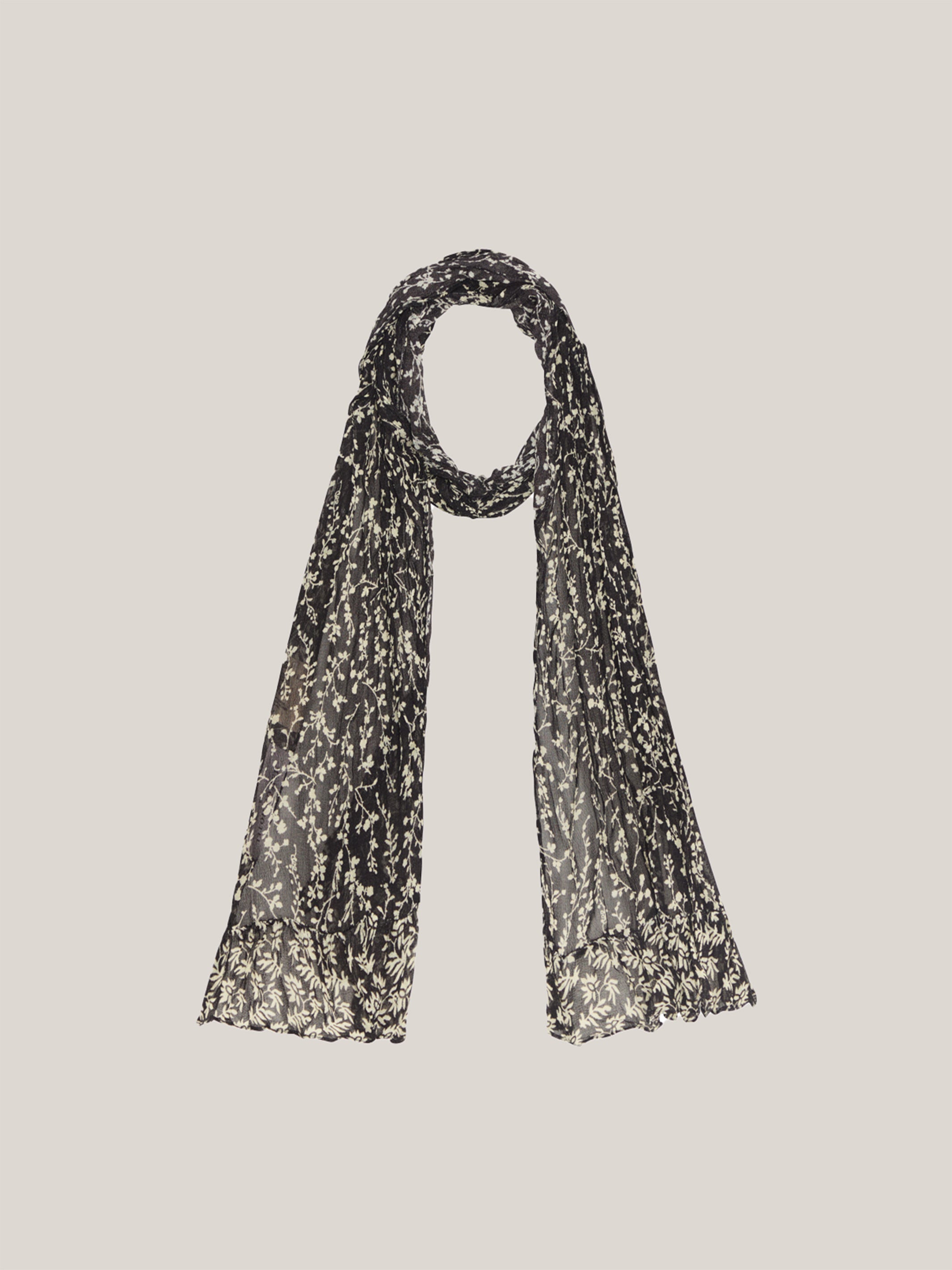 Cut in sheer georgette viscose with a faint glisten, the Monet scarf rests on a dark ground scattered with off–white motifs.