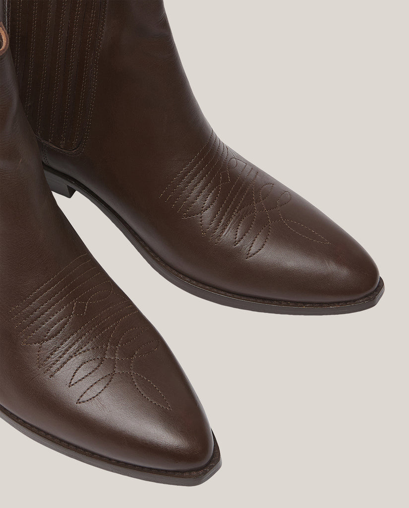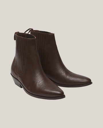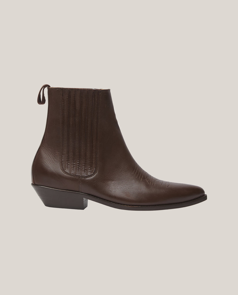 Our first-ever Maison Hotel boots. The Bobby Boot comes cut in sleek espresso- leather, its sharp pointed toe and angled Cuban heel giving it undeniable presence. A new icon for the road ahead.