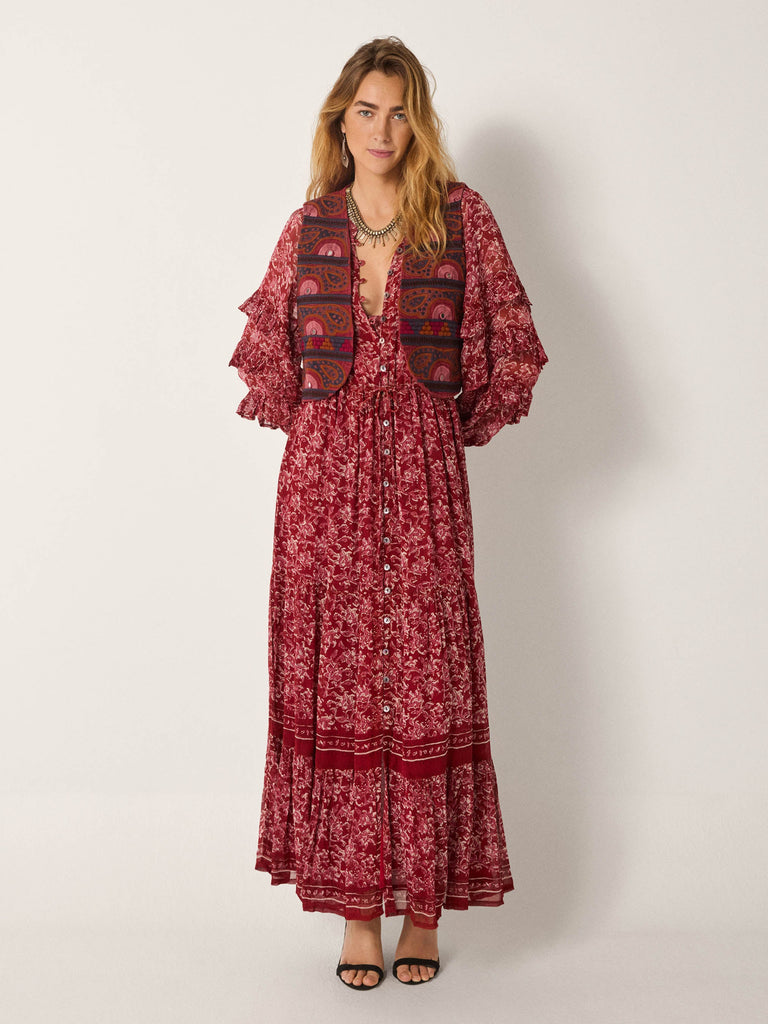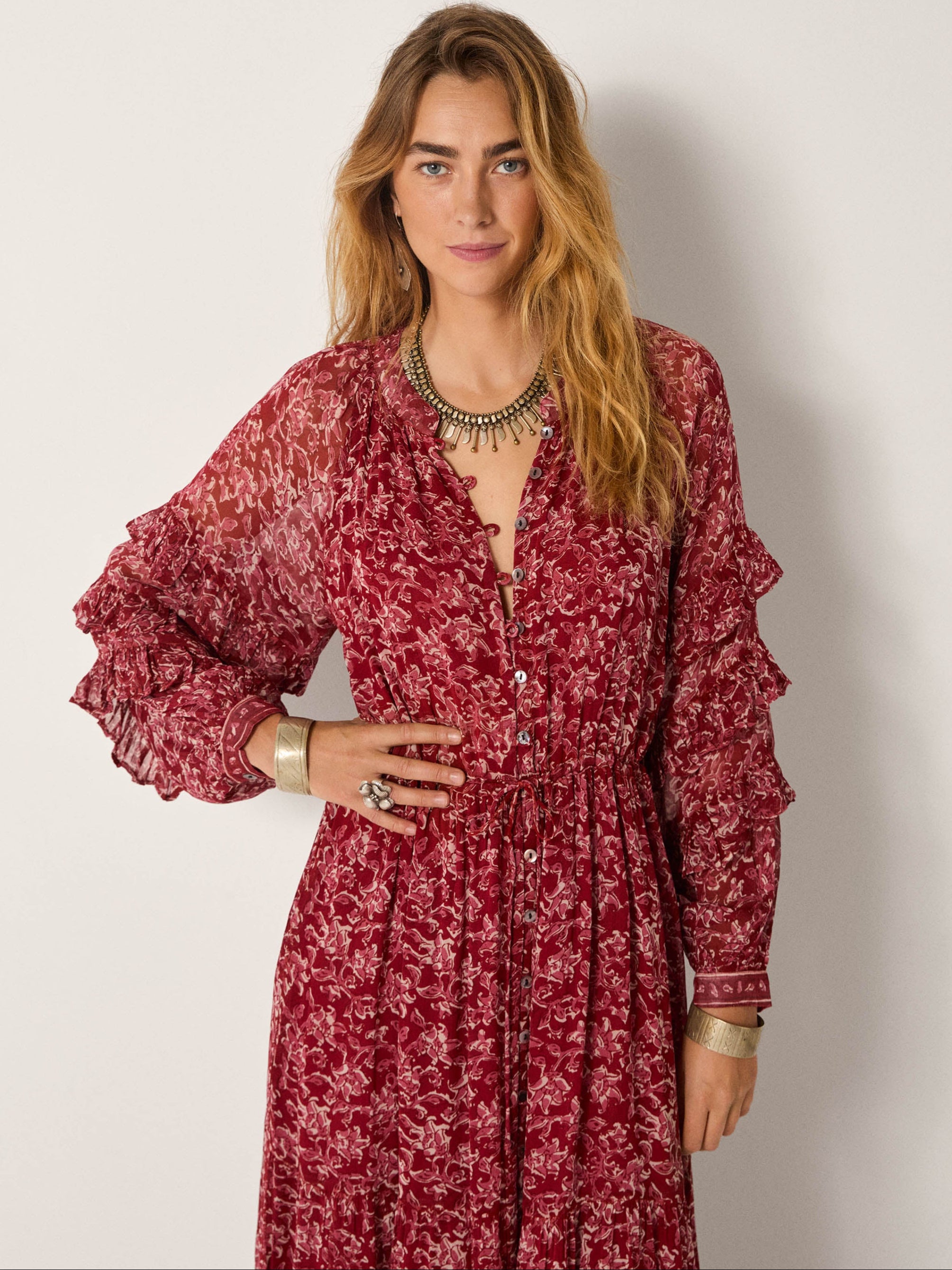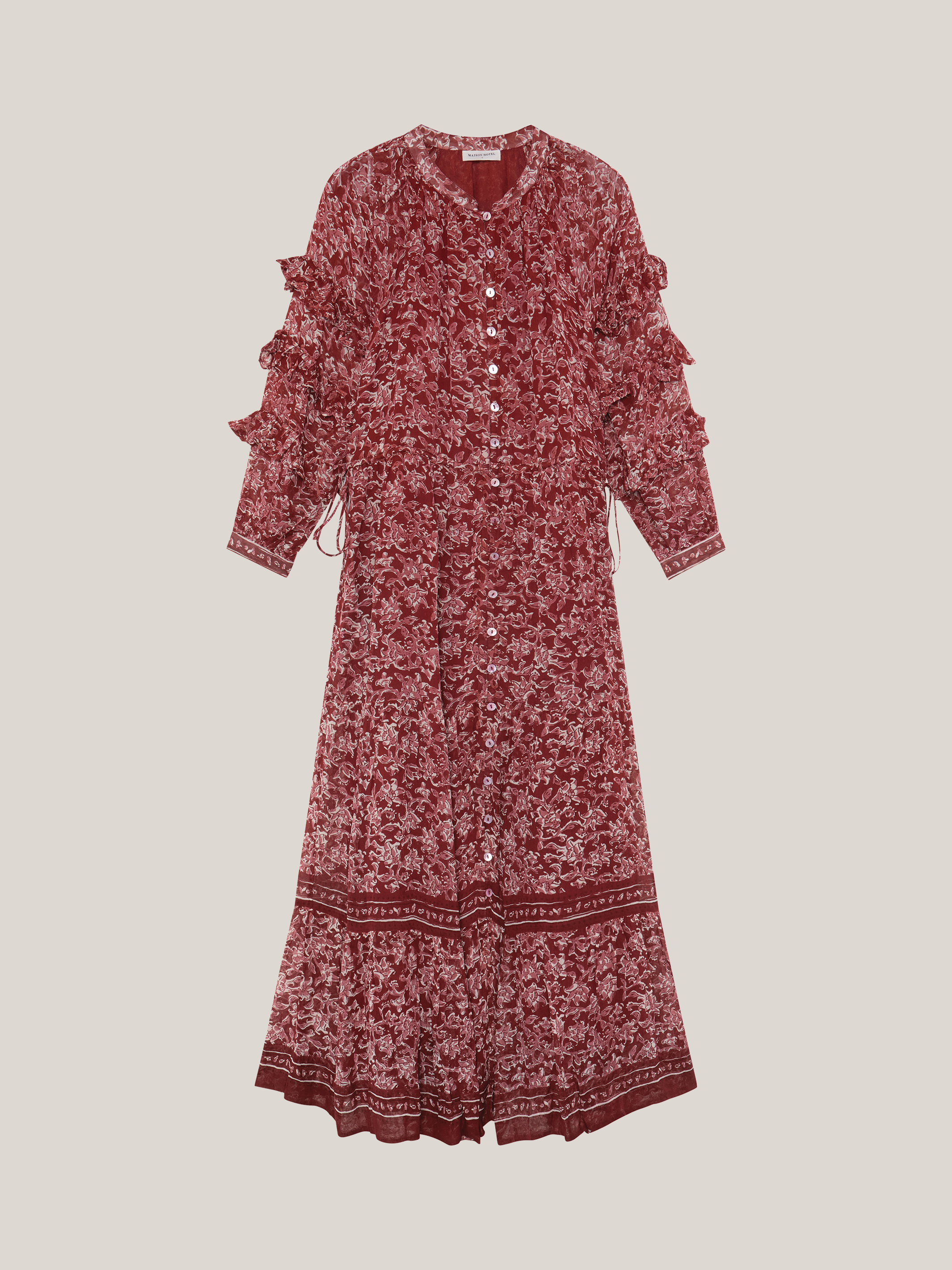 Cut in georgette viscose, the Harper Dress carries the Red Lion motif — crimson ground scattered with pale florals, framed by slim borders at the hem. The print has depth and texture, a tone that feels lived-in.