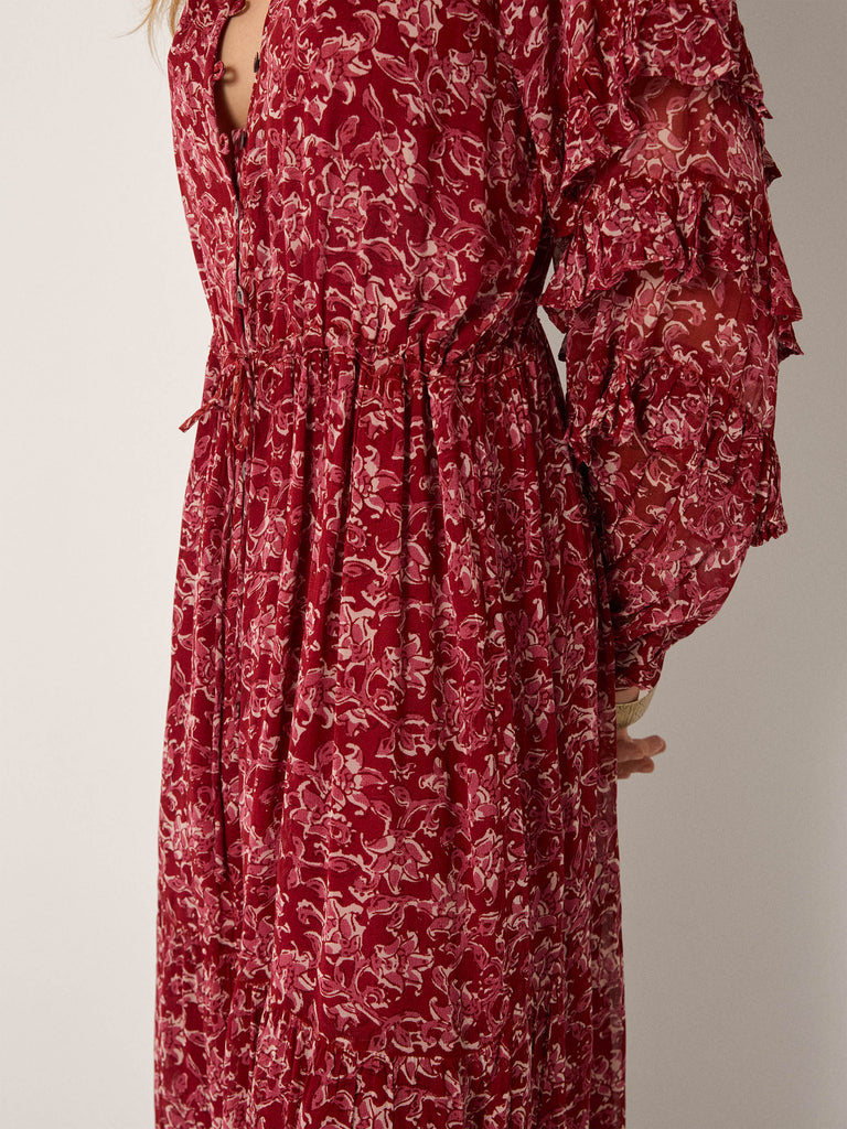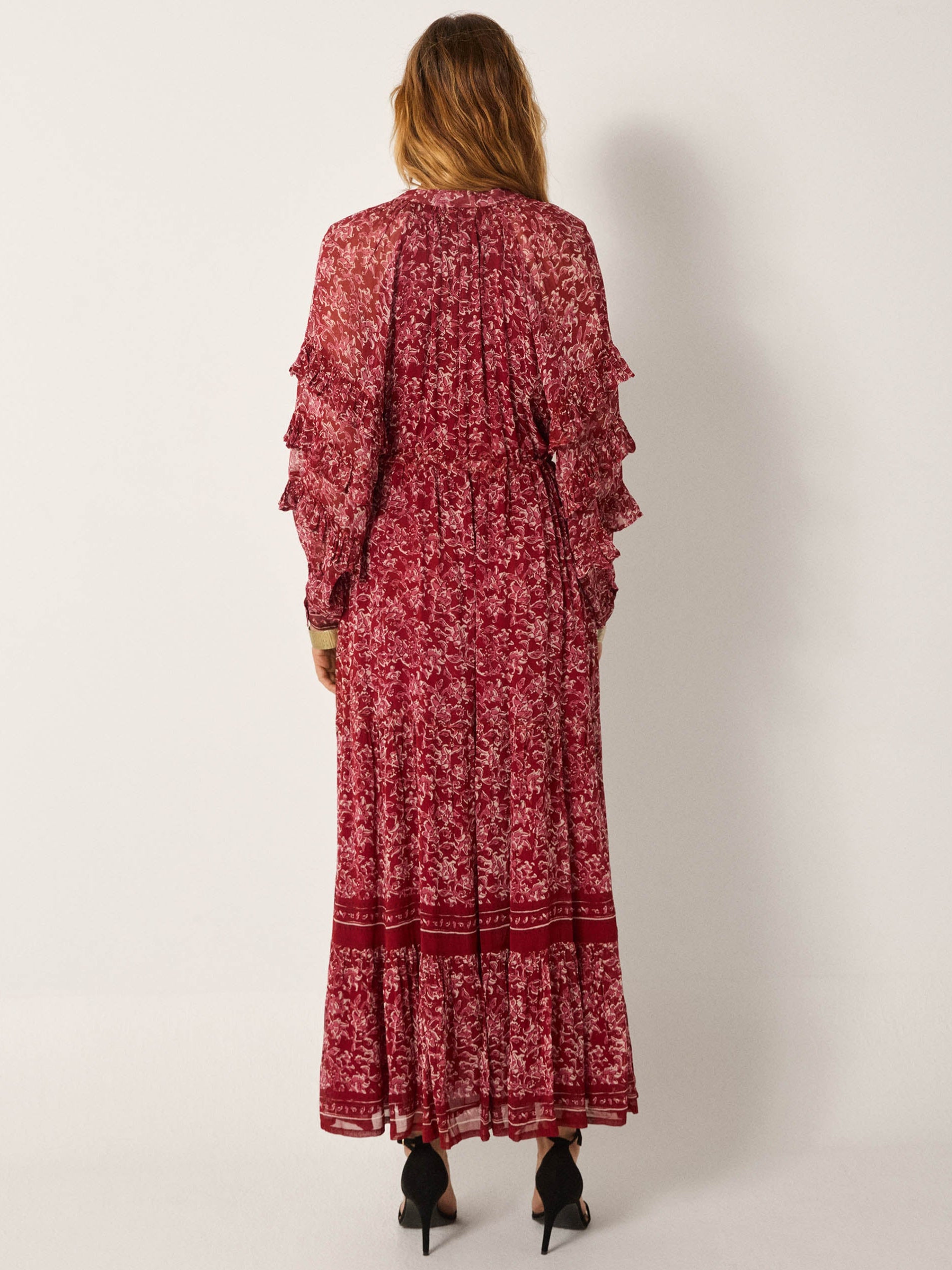The silhouette is long and fluid, tied at the waist for definition. Sheer sleeves fall full, broken with ruffles that add movement and a note of drama. Tiered panels widen towards the hem, giving the dress a quiet rhythm as it moves.