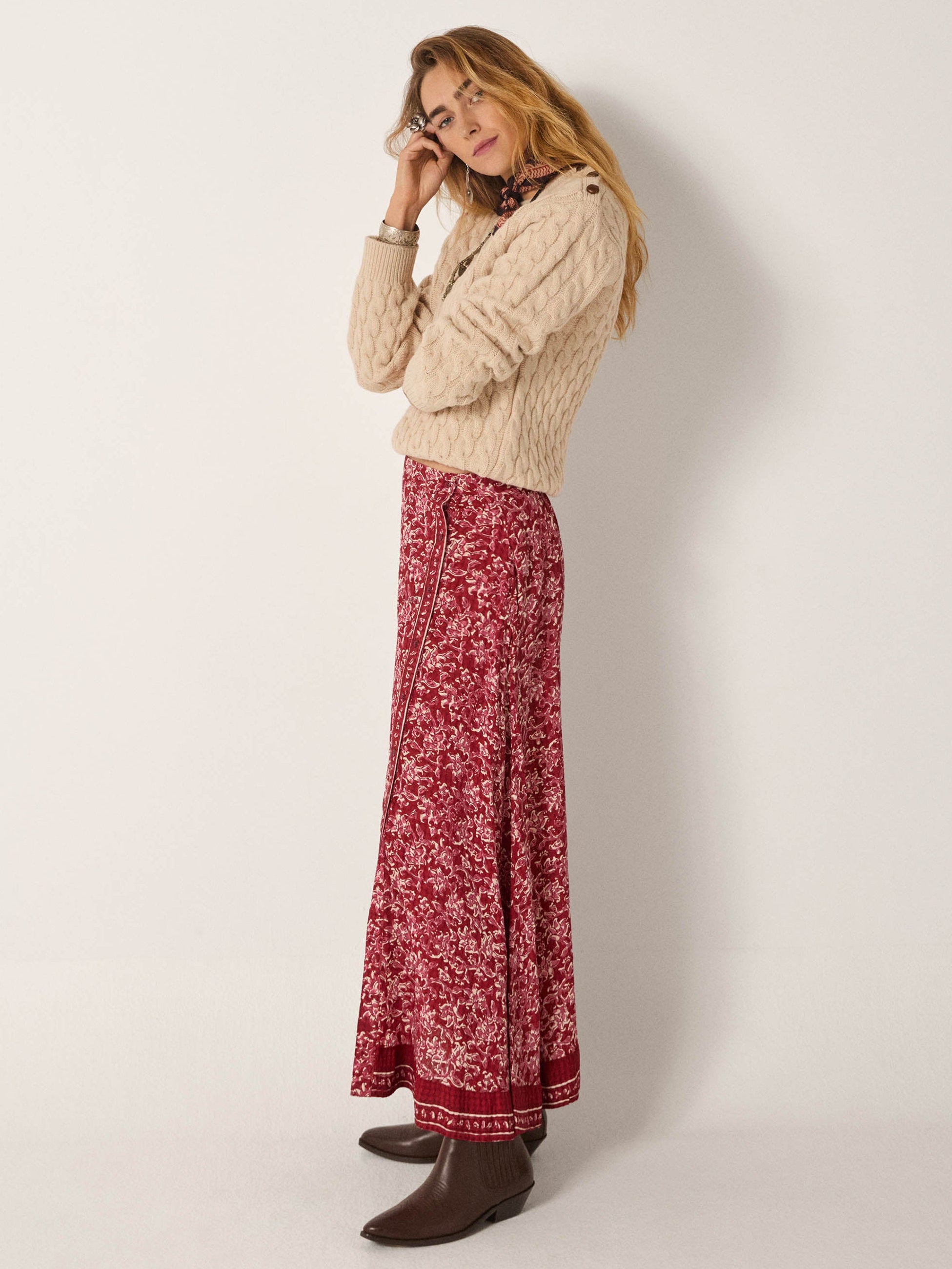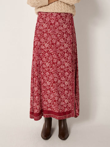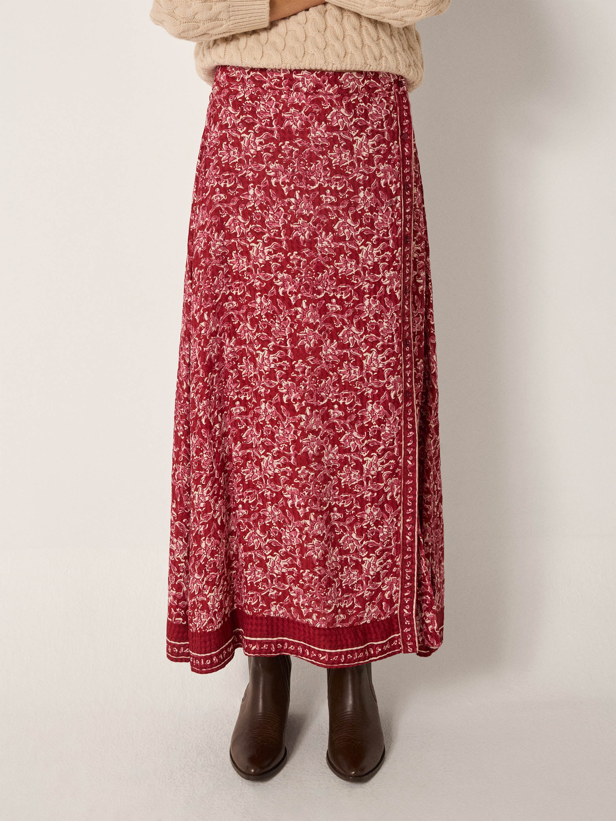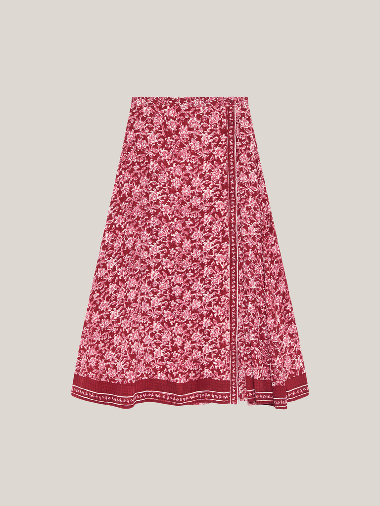 Viscose skirt printed in the Red Lion motif — a crimson ground broken with pale florals and framed by a narrow border at the hem. The color is deep, closer to charcoal reds than bright tones.