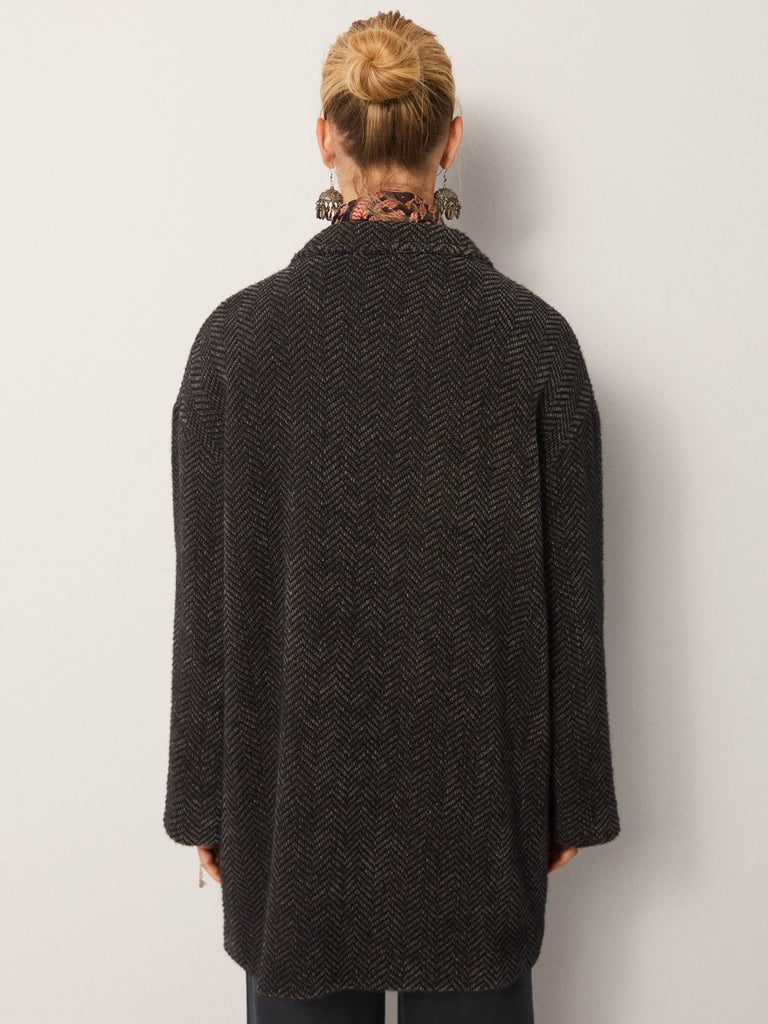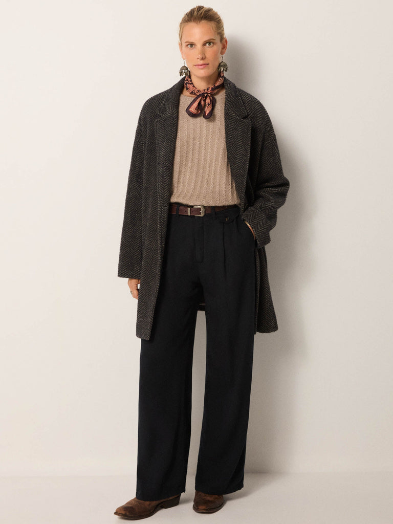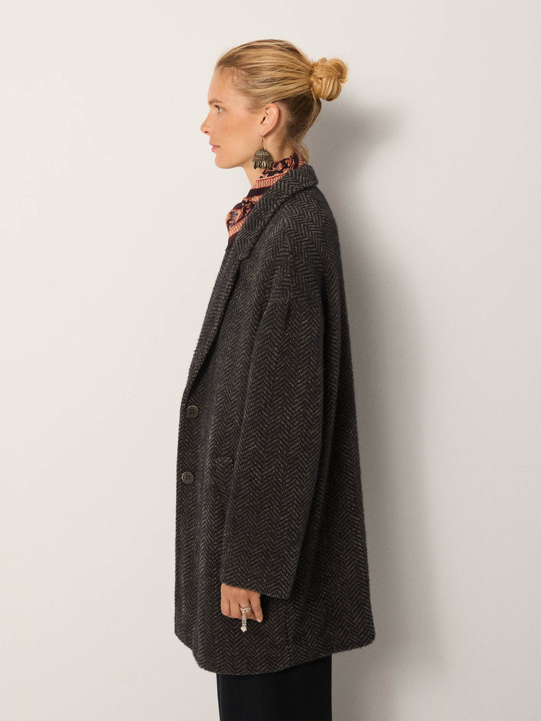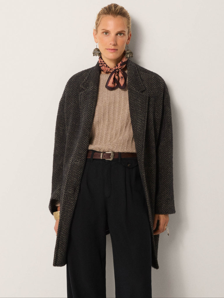 Wool blend in a dark herringbone, cut oversized with dropped shoulders and a long line. It has the weight and presence of a classic men’s coat, softened by volume and ease.