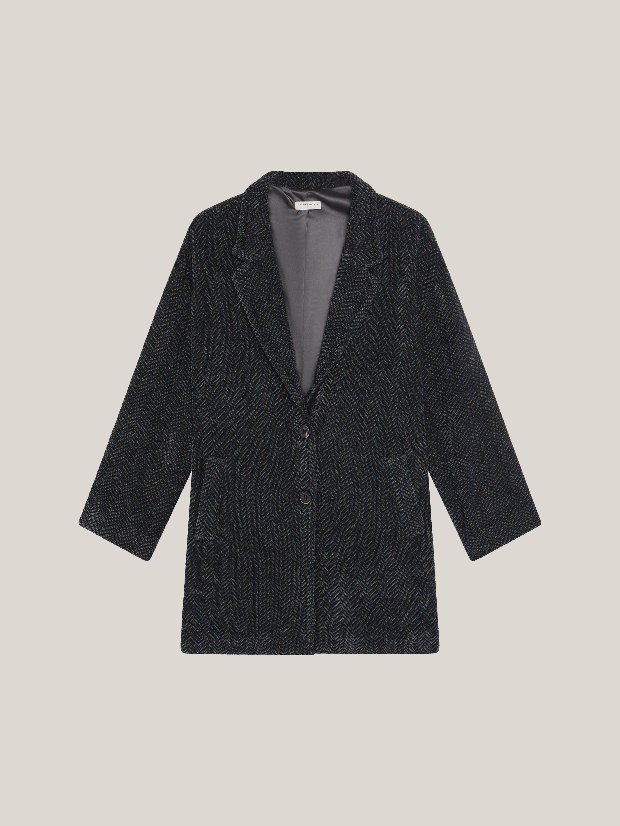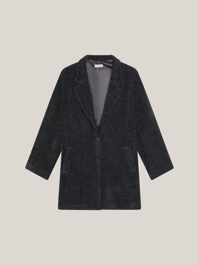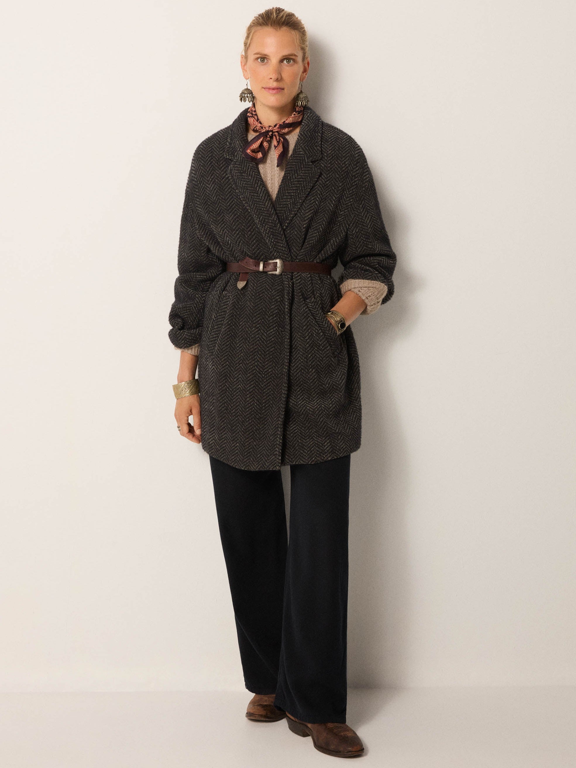 Wool blend in a dark herringbone, cut oversized with dropped shoulders and a long line. It has the weight and presence of a classic men’s coat, softened by volume and ease.
