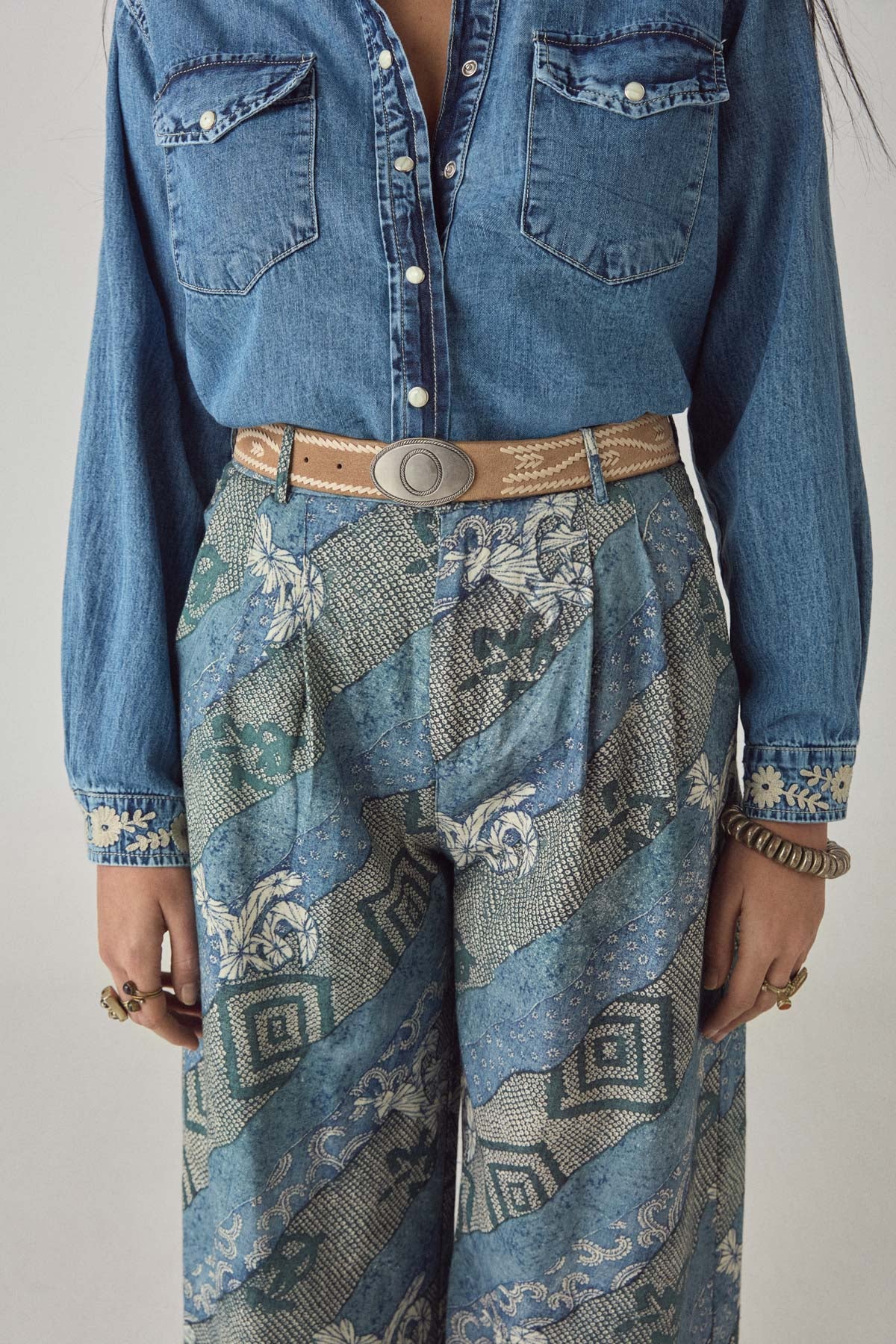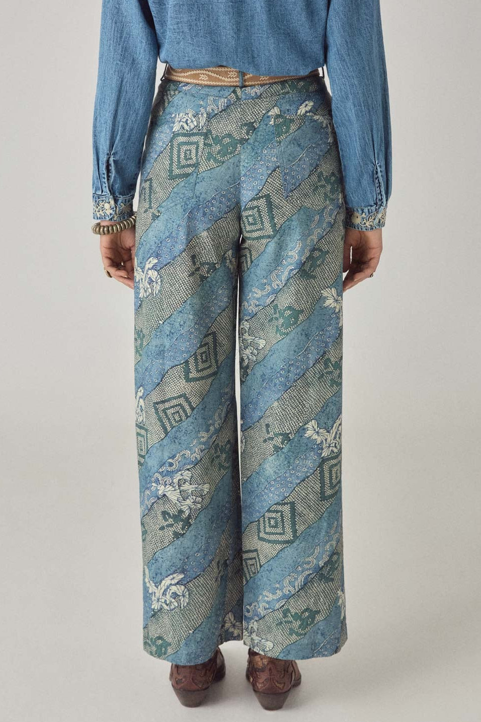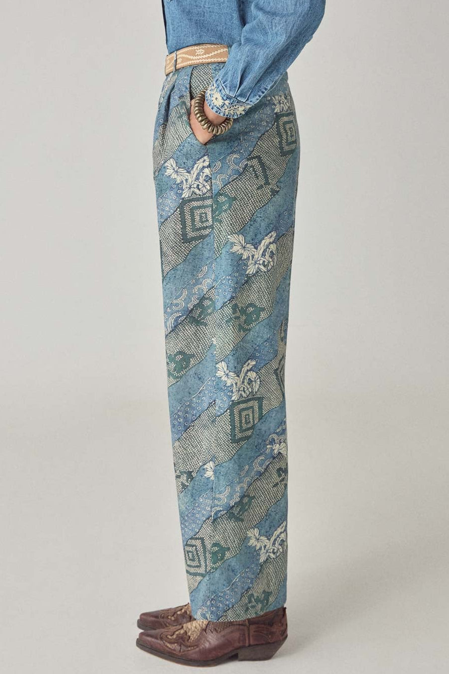 Wide-leg trouser in soft cotton with layered indigo floral print. High waist with button and zip closure, two front pockets. Relaxed through the leg with natural fall. Cotton fluid and easy, designed for movement.
