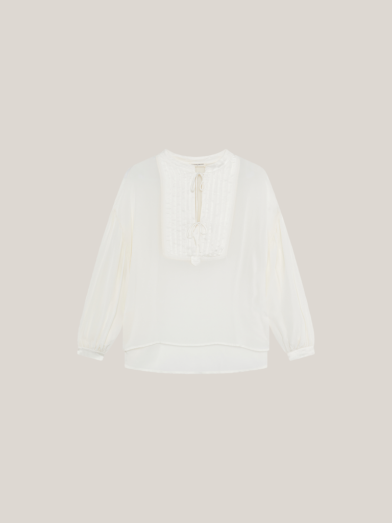 A refined blouse cut from fluid viscose, carrying a soft fall and natural movement. The off-white tone feels bright but not stark, closer to parchment than pure white.
