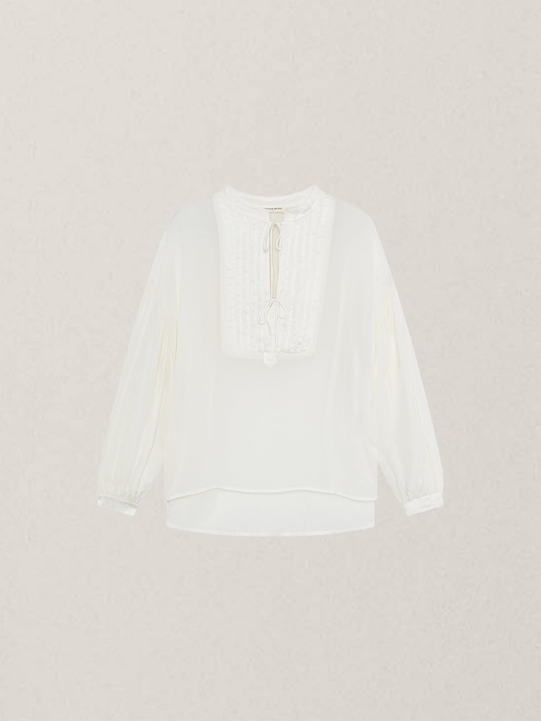 A refined blouse cut from fluid viscose, carrying a soft fall and natural movement. The off-white tone feels bright but not stark, closer to parchment than pure white.