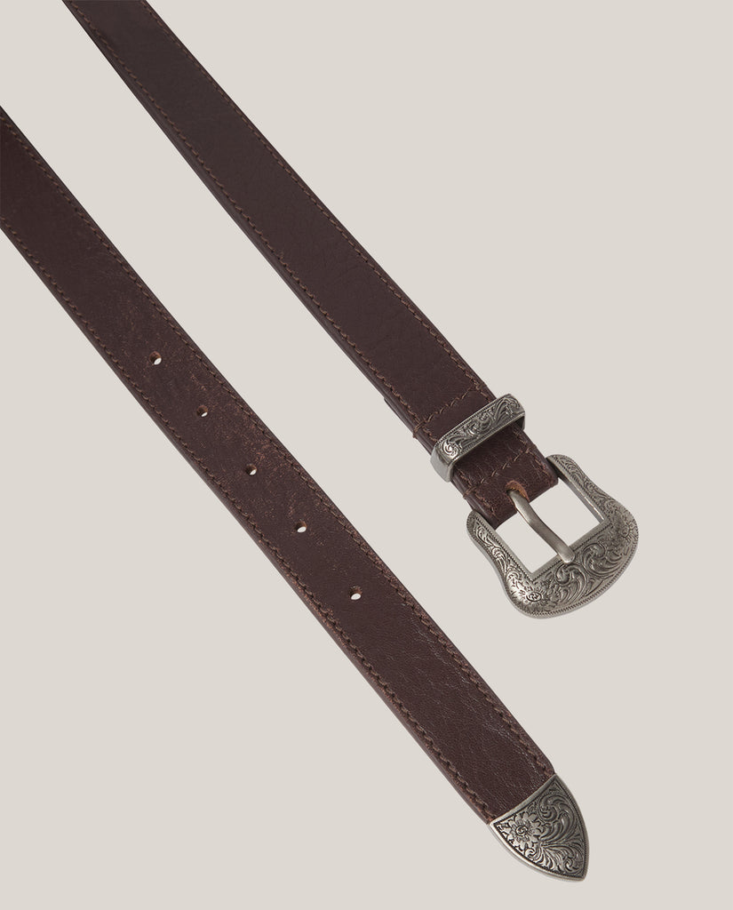 Crafted from smooth brown leather with a rich patina finish. Its antique silver buckle, detailed with subtle engravings, gives it a timeless western-inspired character. A versatile everyday accessory designed to age beautifully with wear.